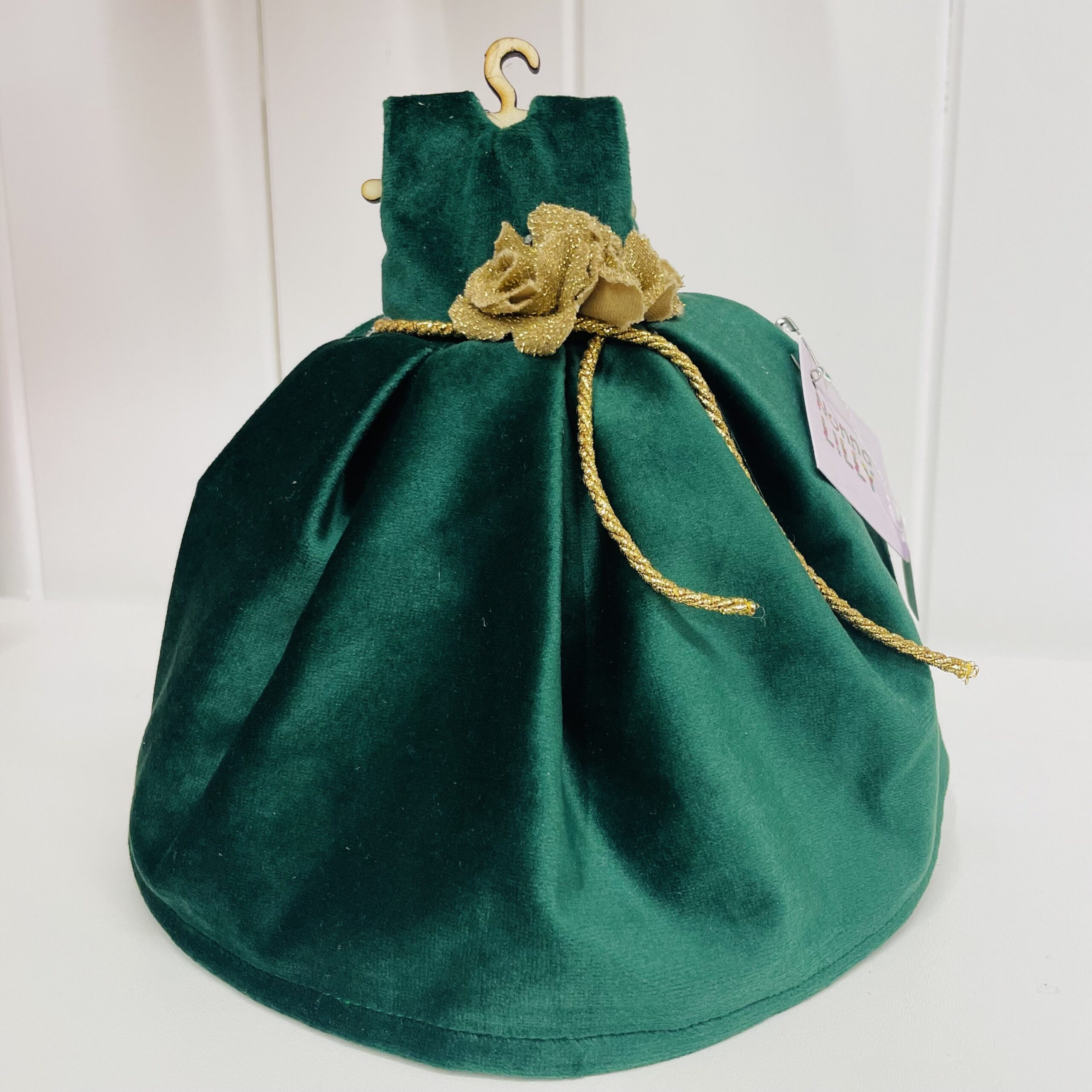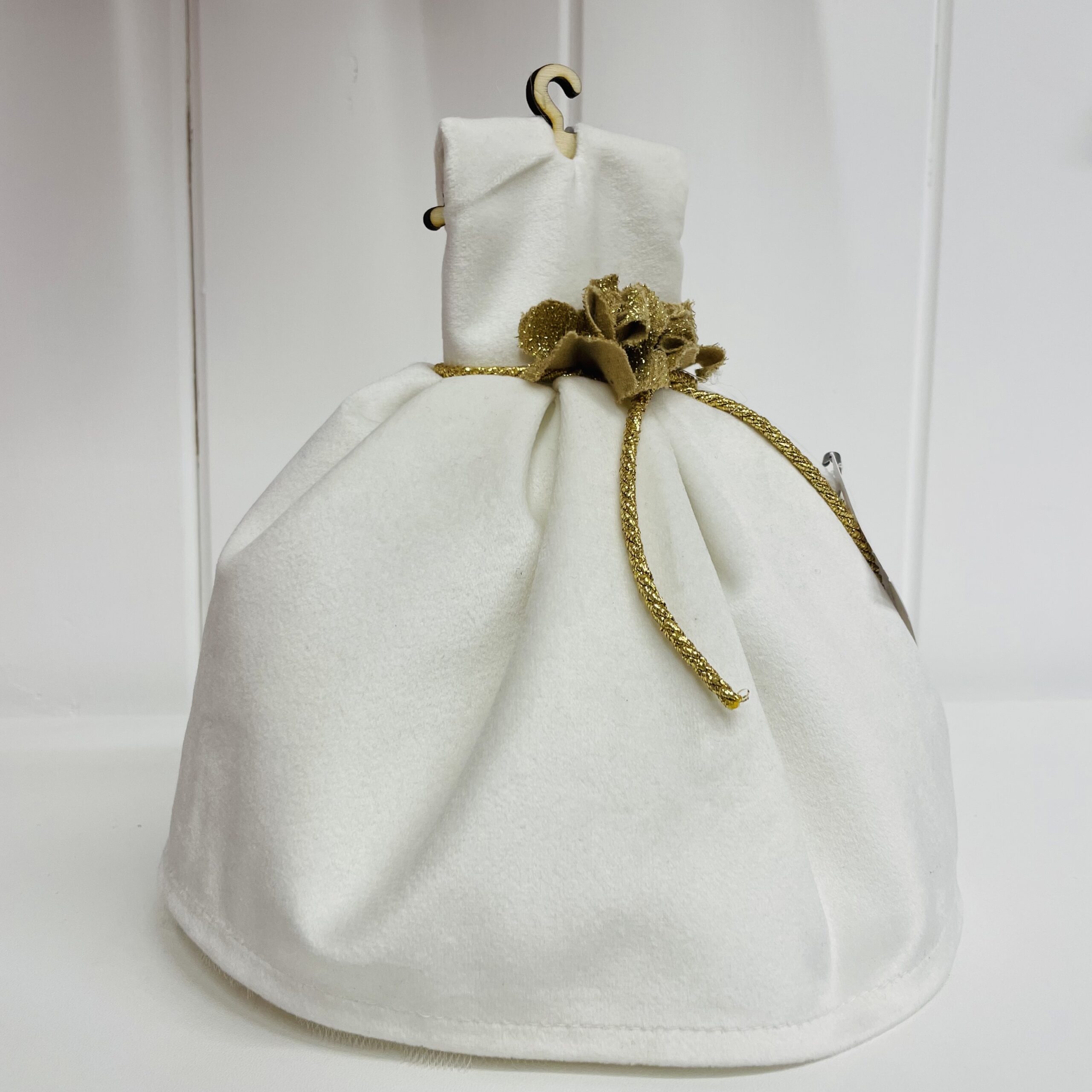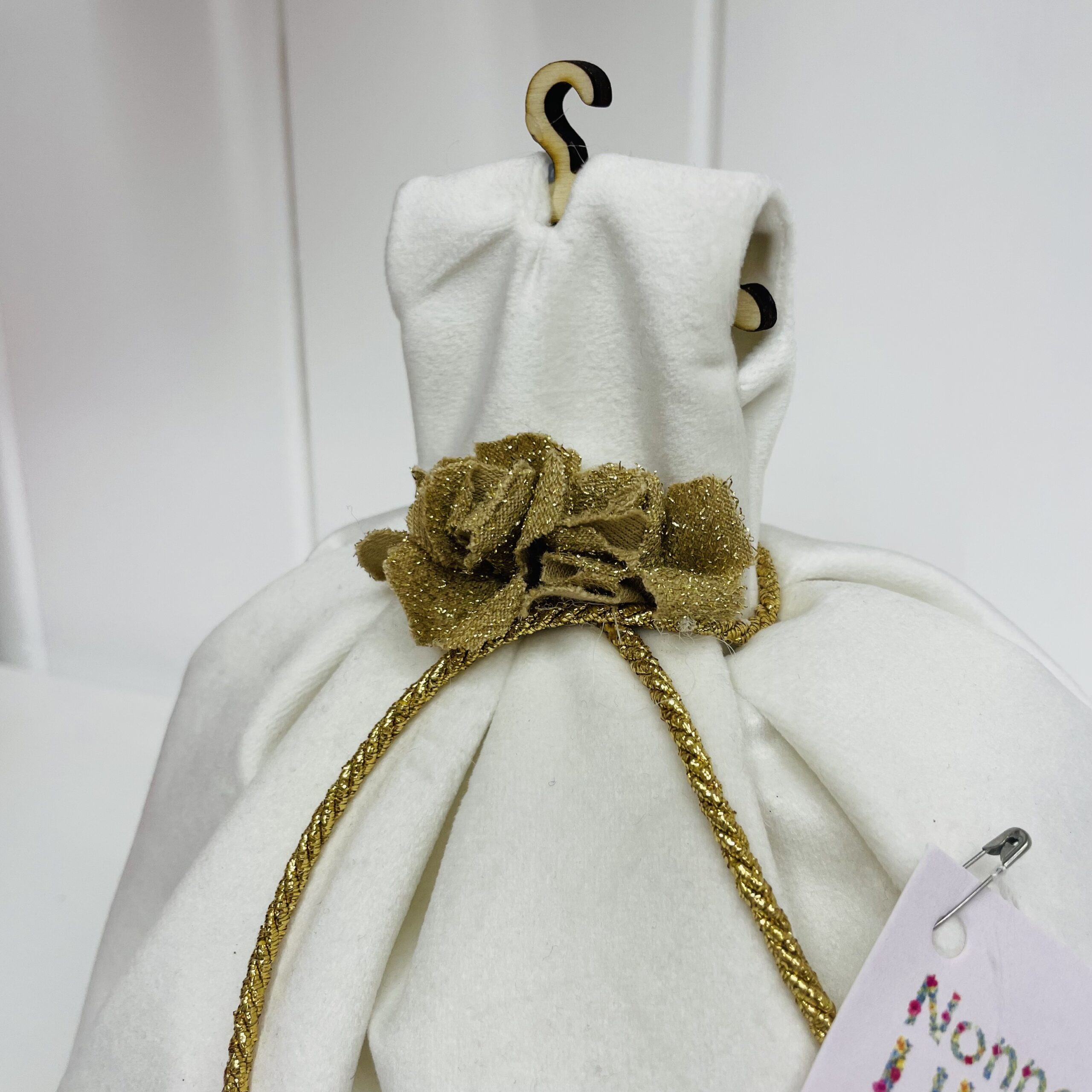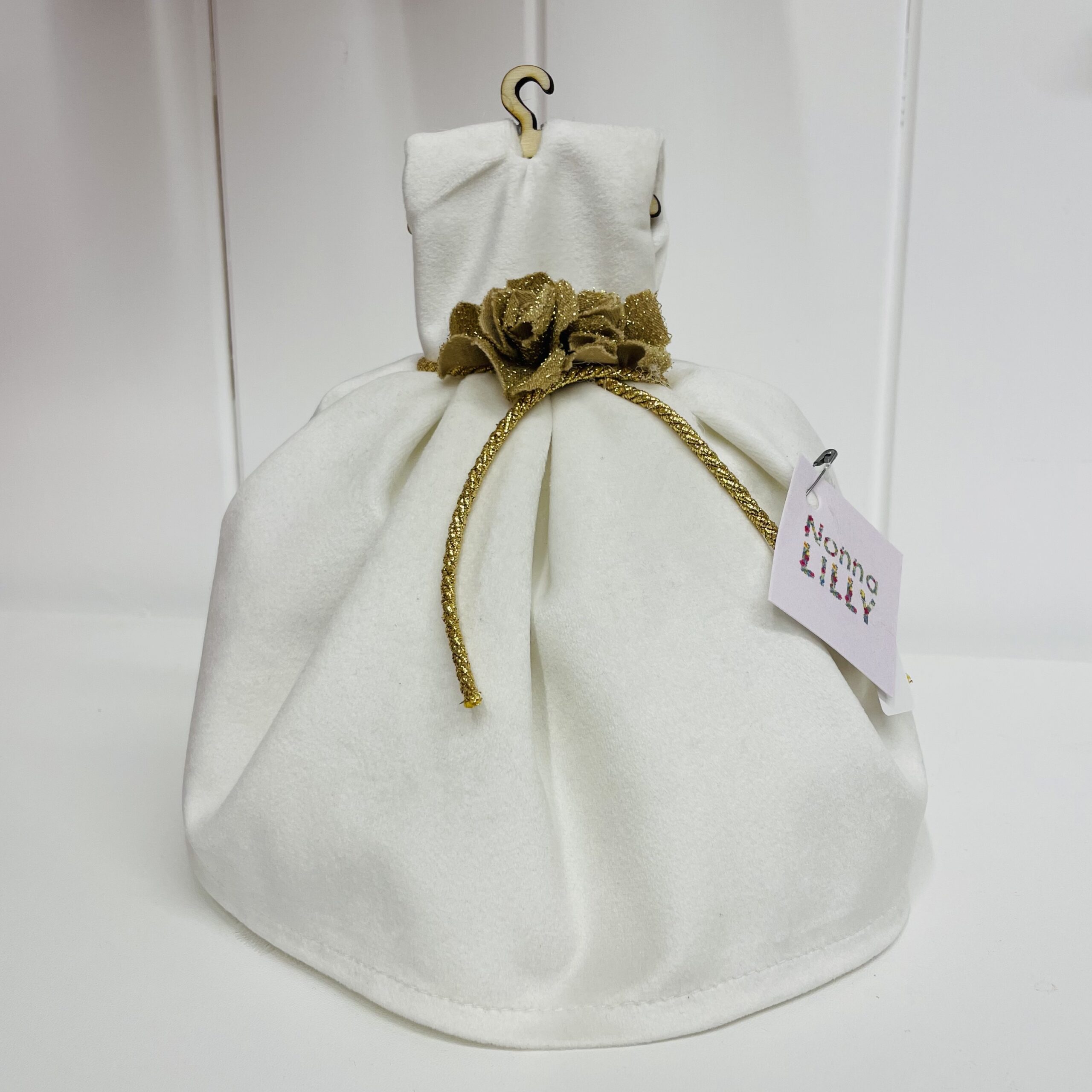 Abitino sartoriale in velluto, con una cintura in vita fatta di fiorellini color oro. Sotto la gonna, nascosto nel tulle, c’è un sacchettino trasparente che contiene dei granelli di profumo.