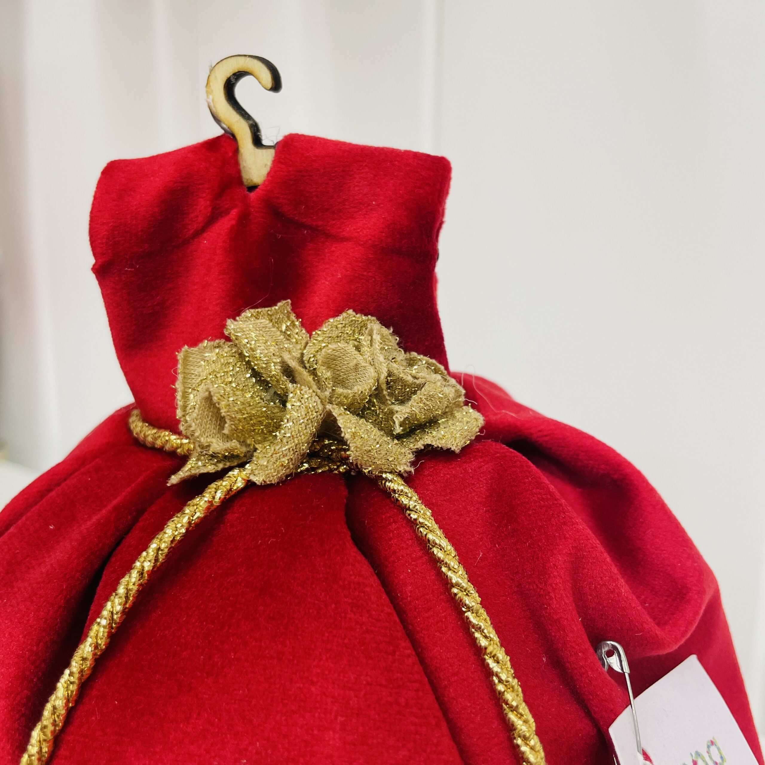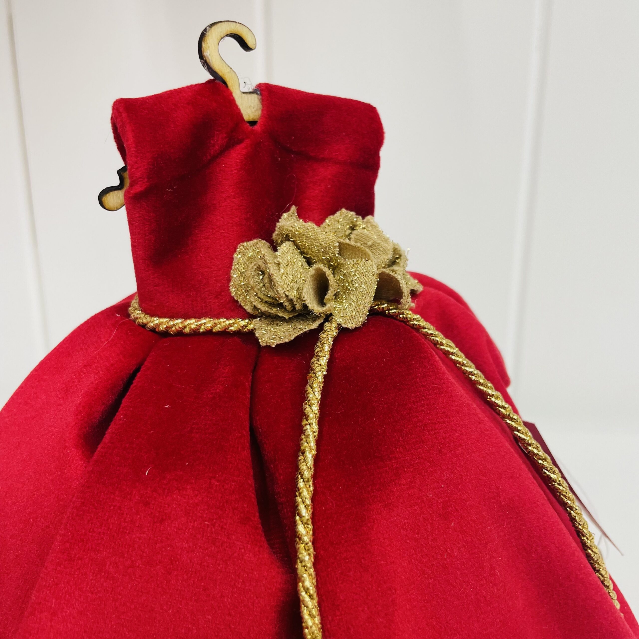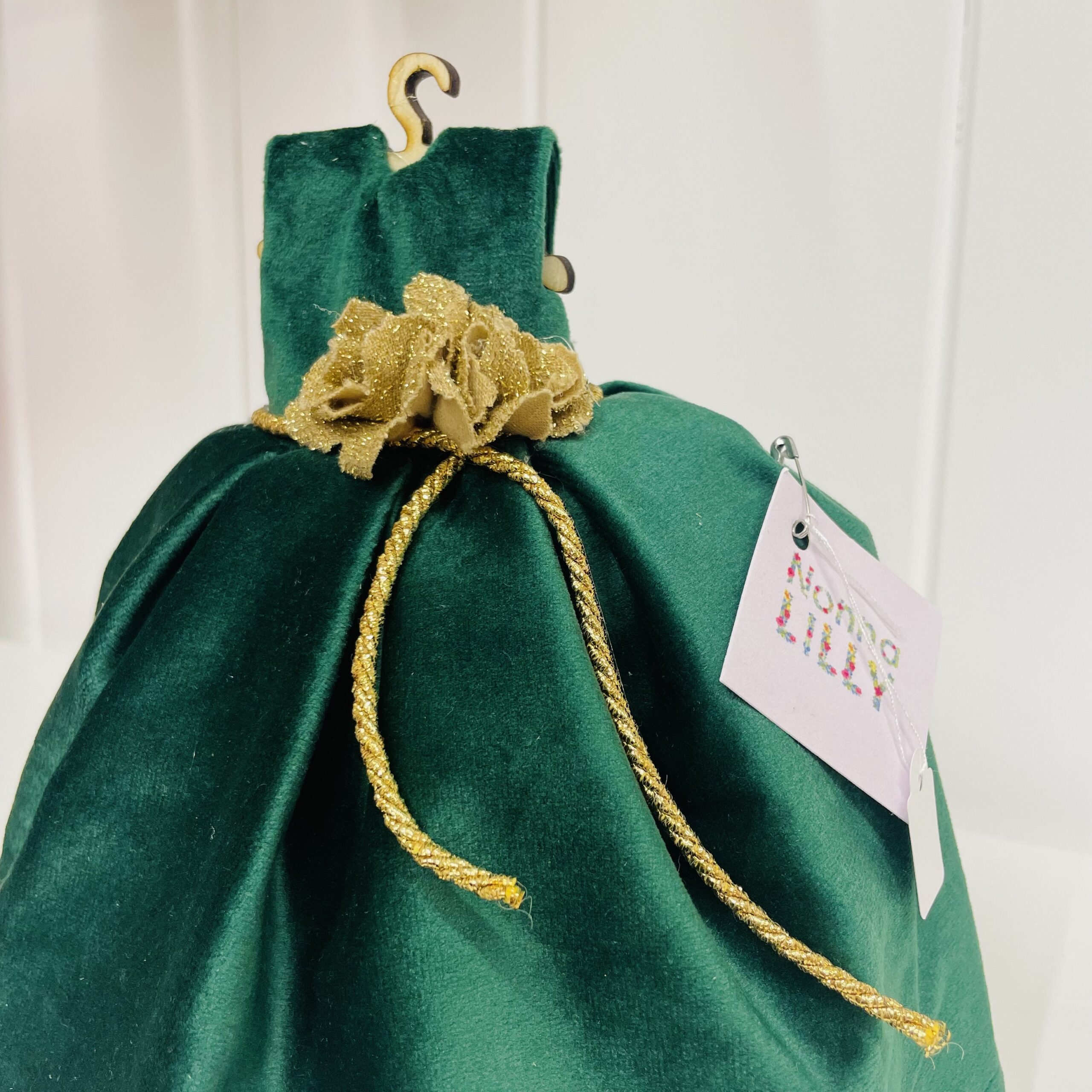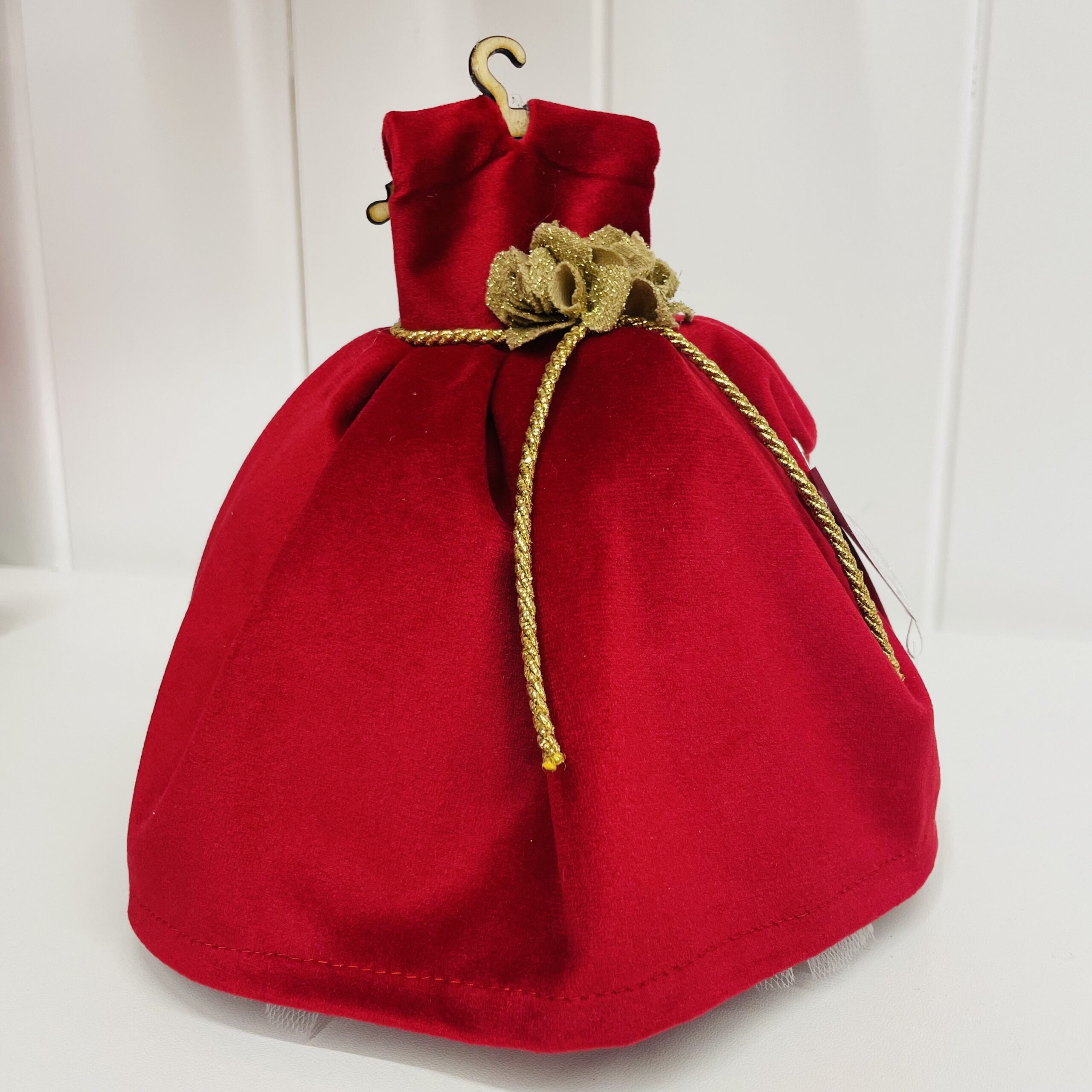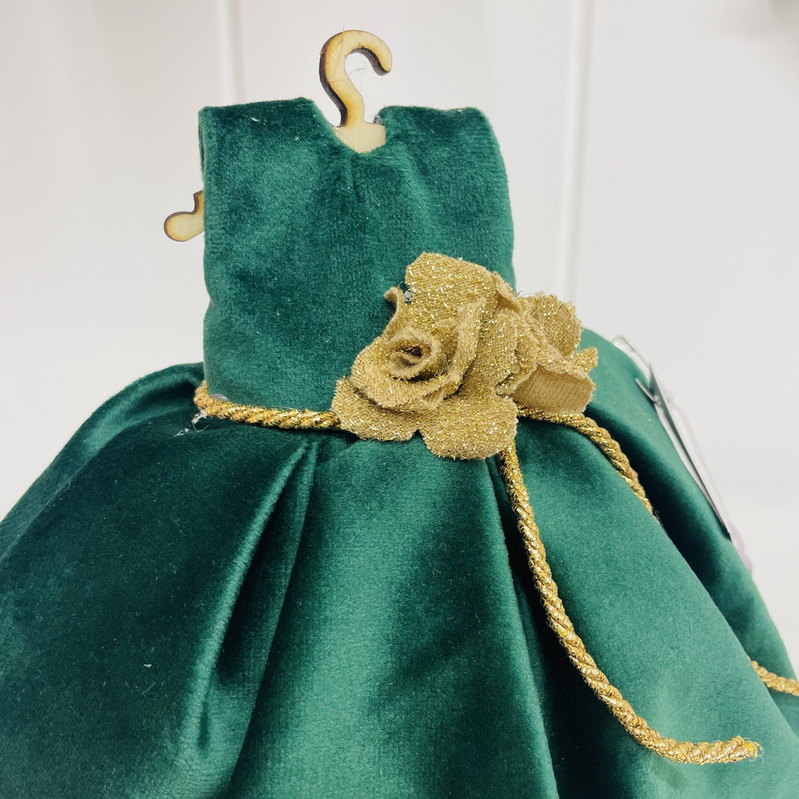 Abitino sartoriale in velluto, con una cintura in vita fatta di fiorellini color oro. Sotto la gonna, nascosto nel tulle, c’è un sacchettino trasparente che contiene dei granelli di profumo.