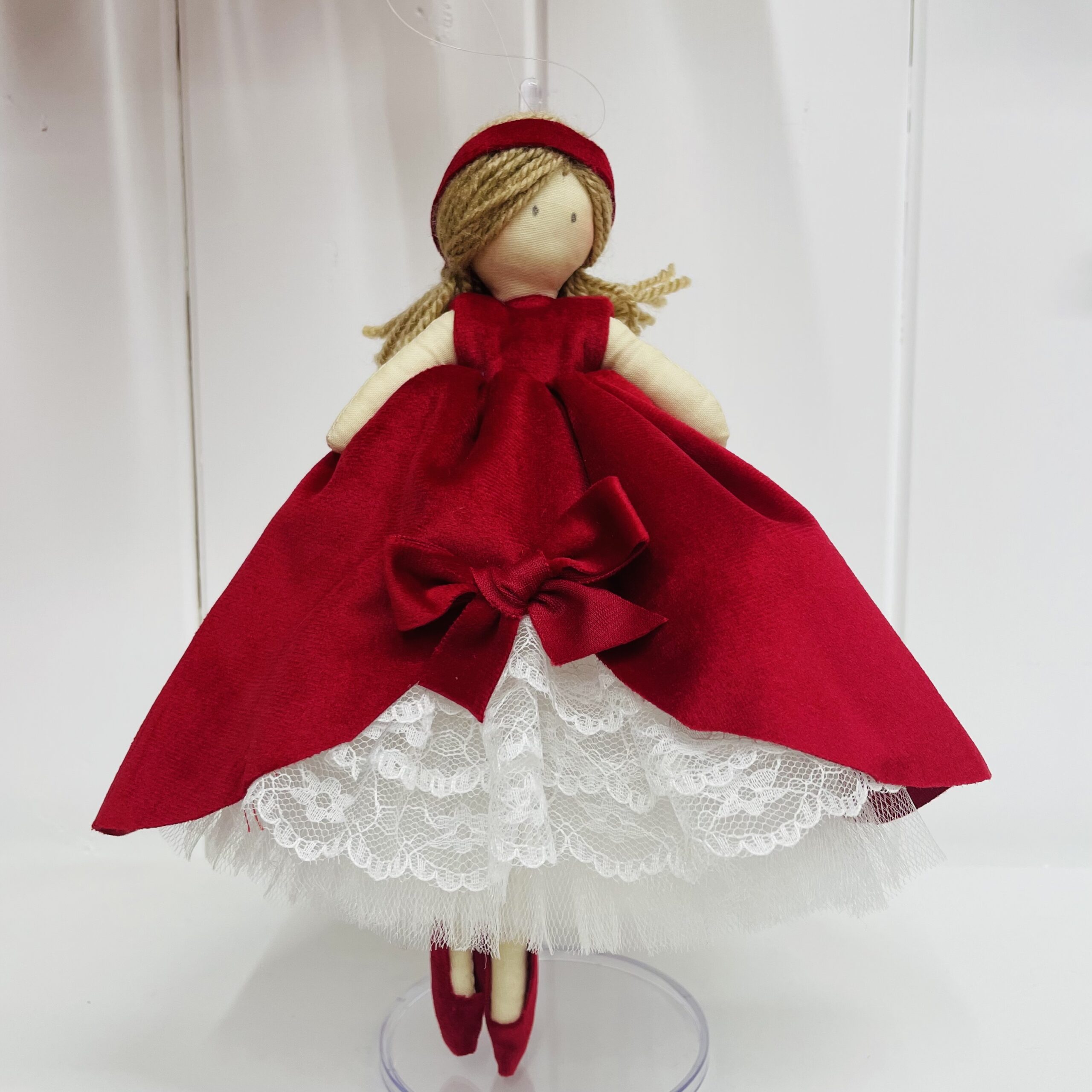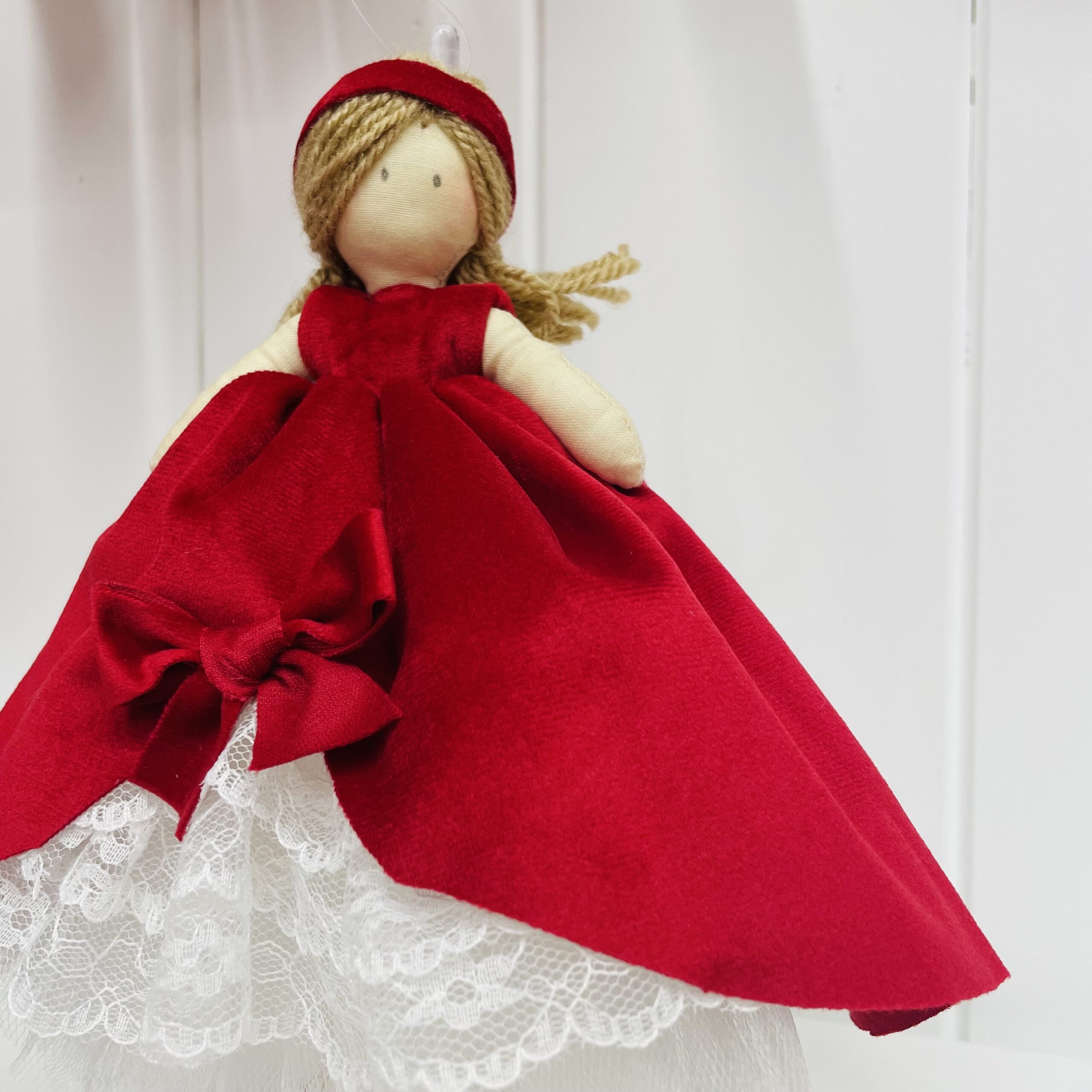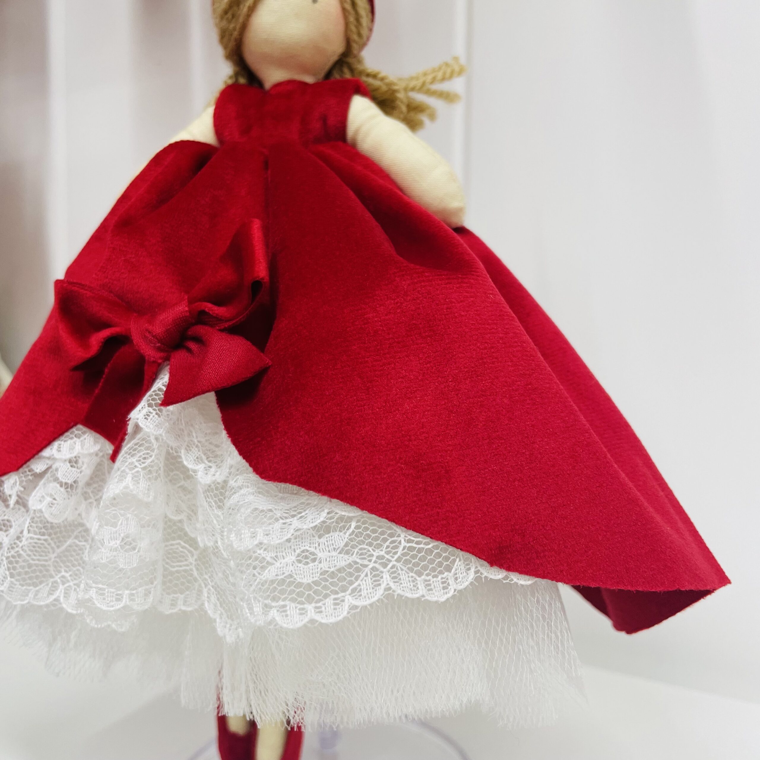 Bambola artigianale con abitino in velluto rosso e pizzo