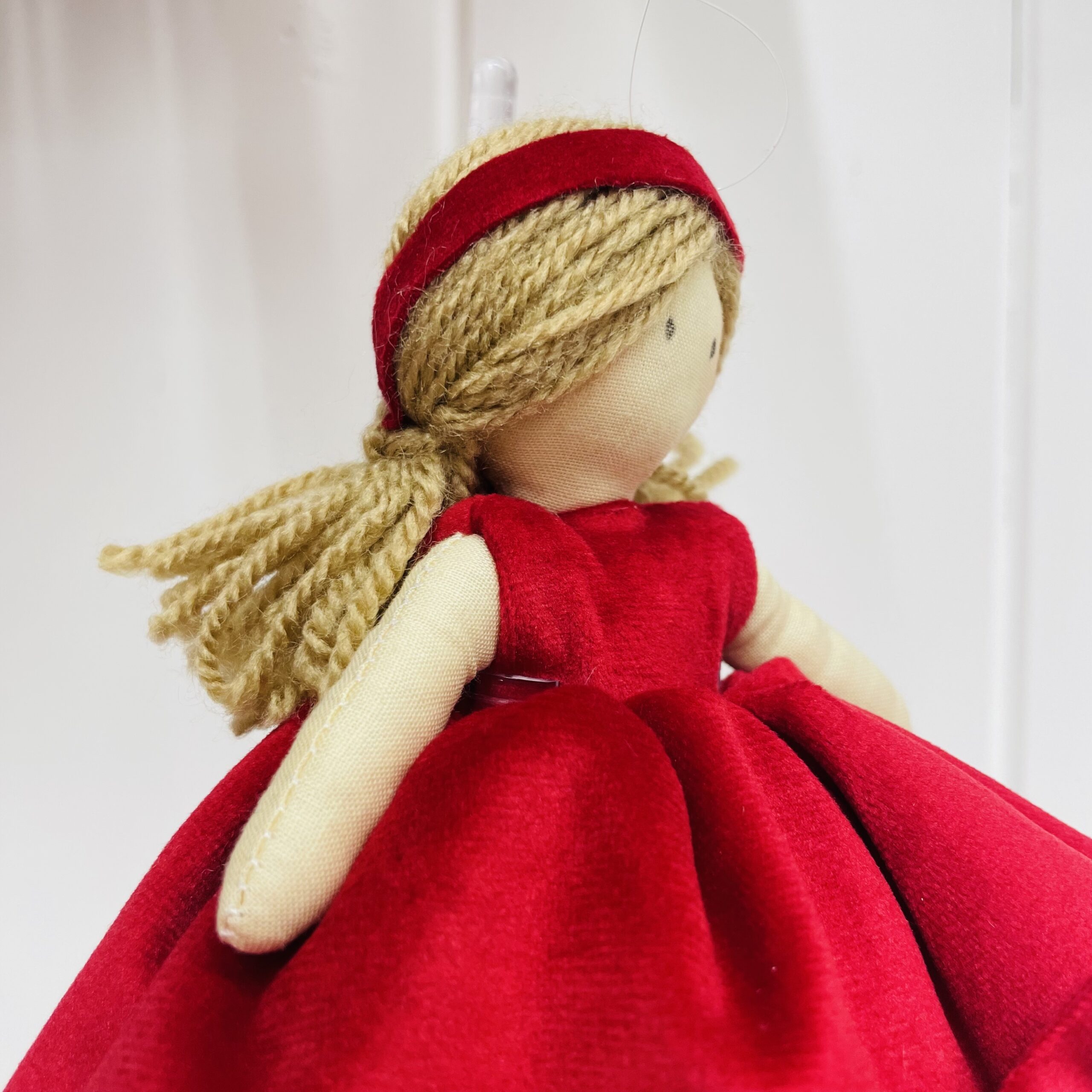 Bambola artigianale con abitino in velluto rosso e pizzo, capelli raccolti in una fascia in velluto rosso