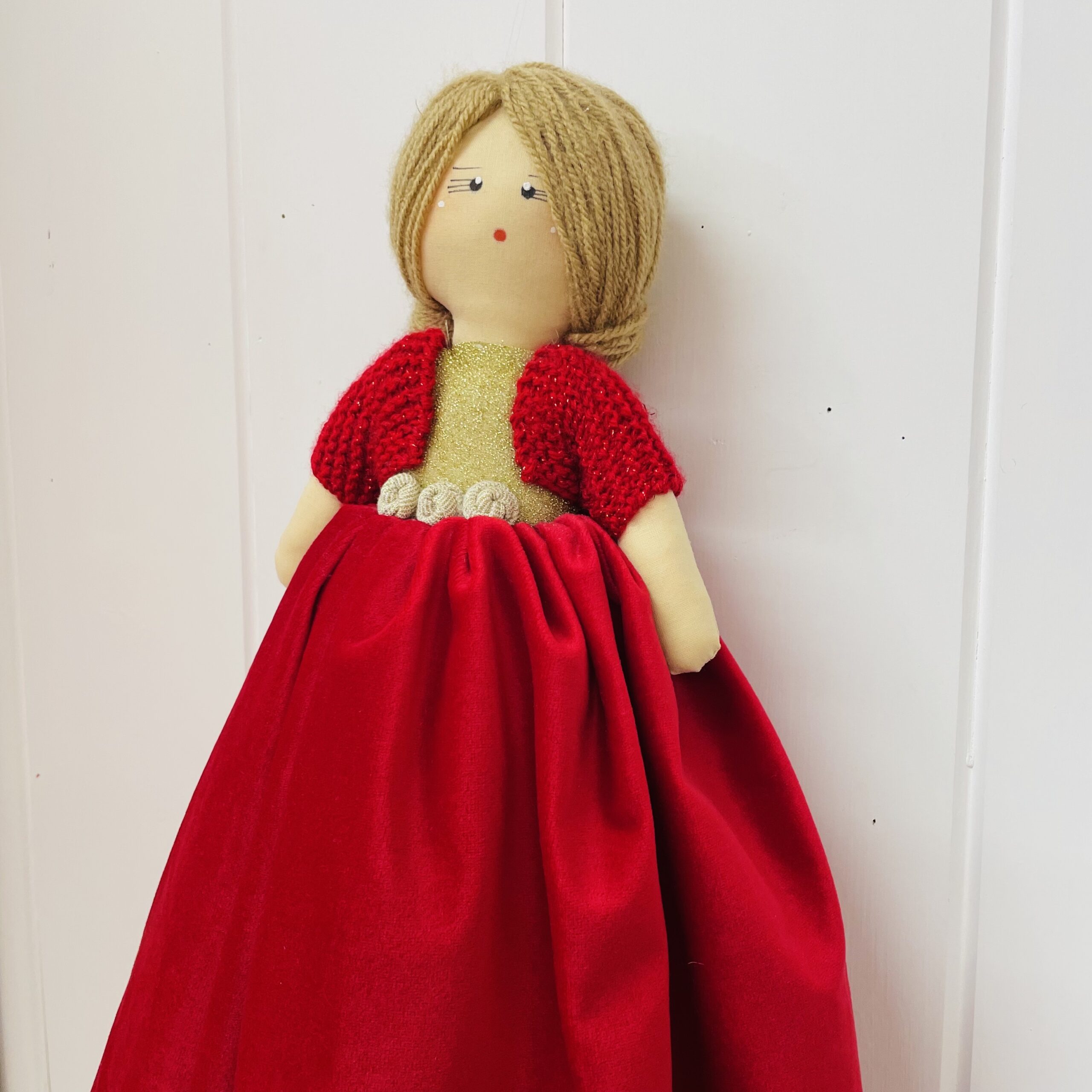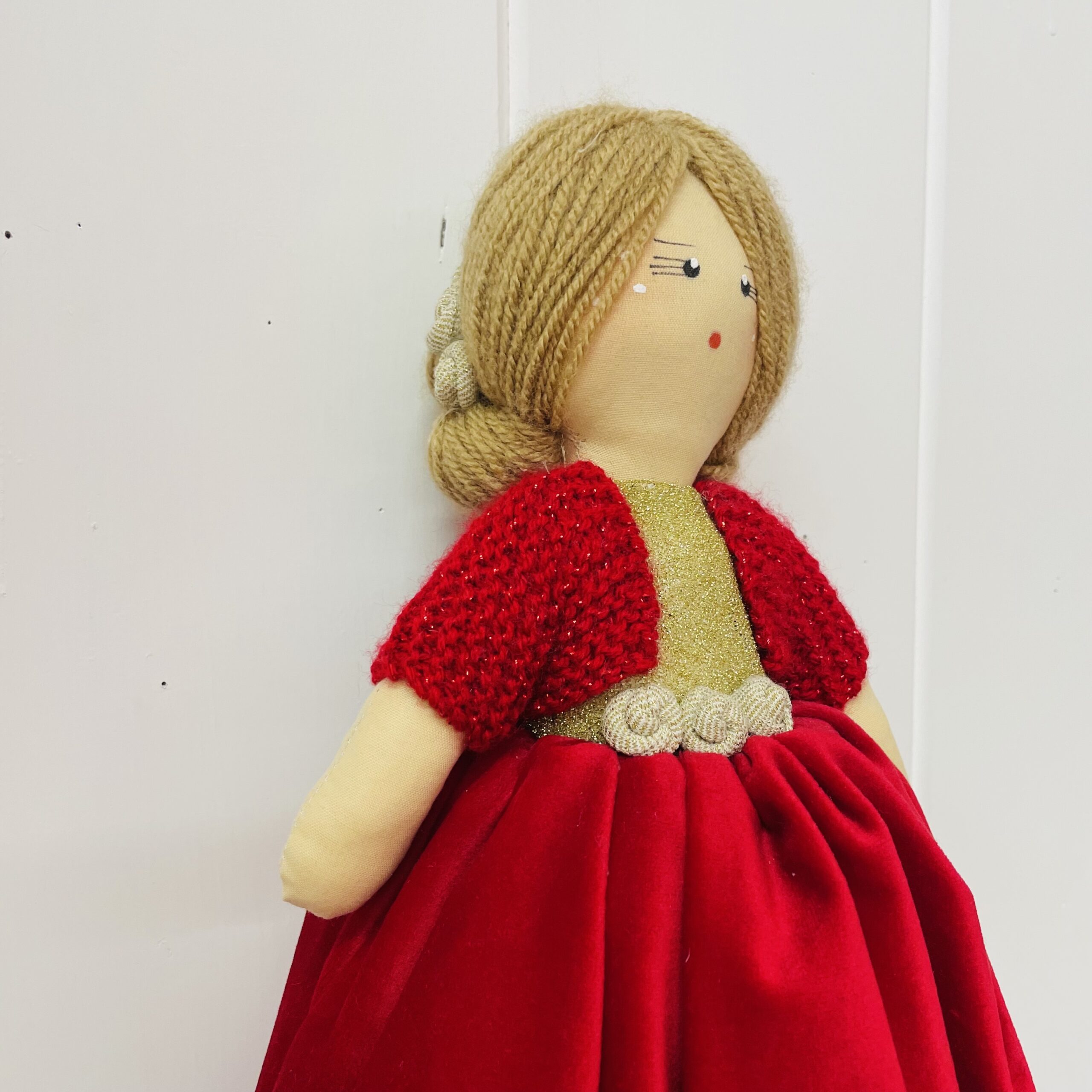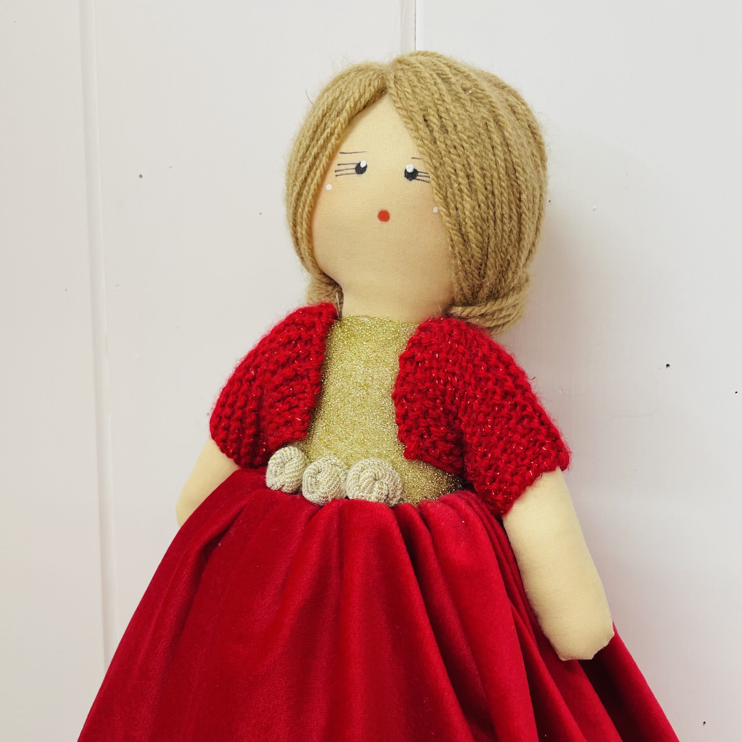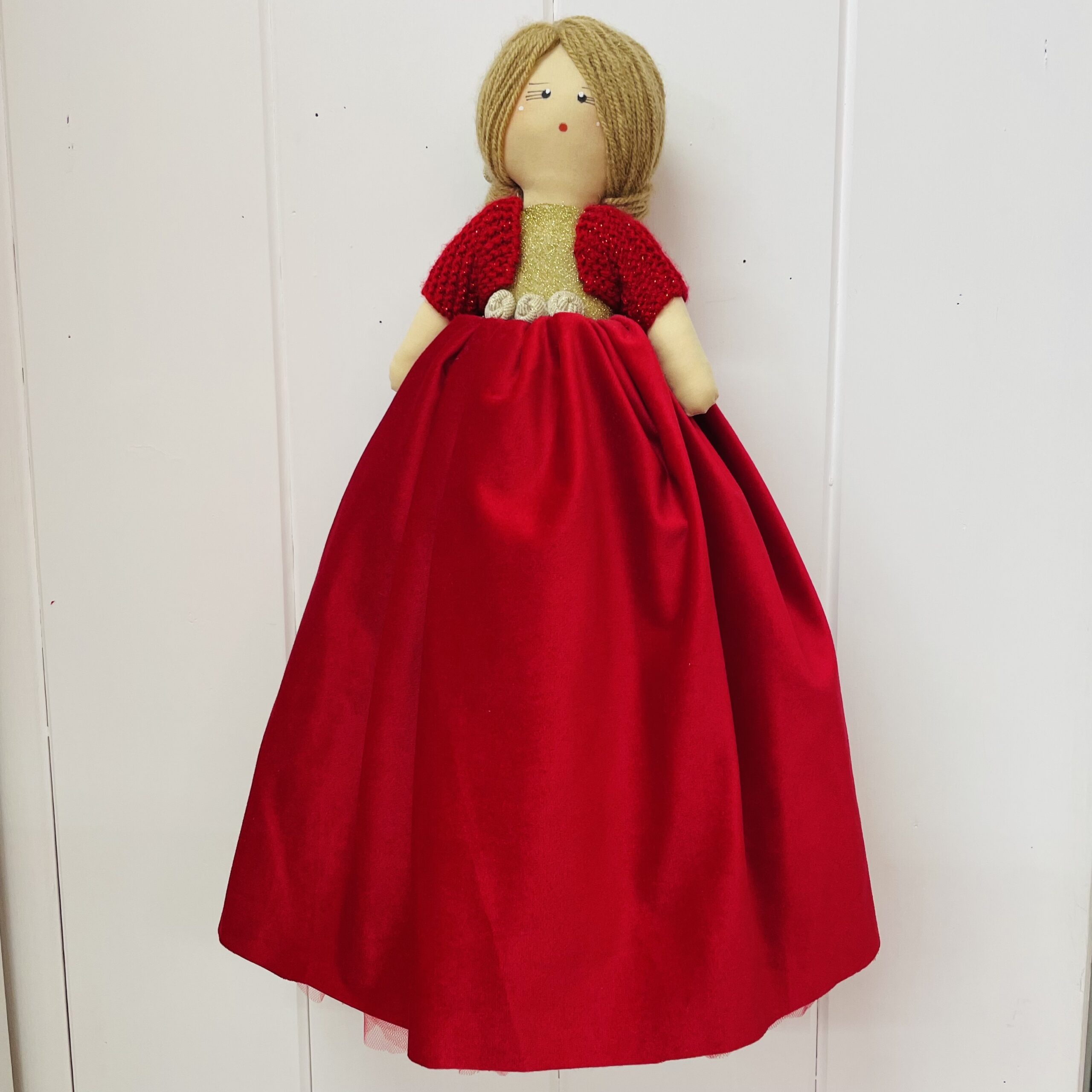 Bambola artigianale con abito rosso in velluto e cardigan in lana