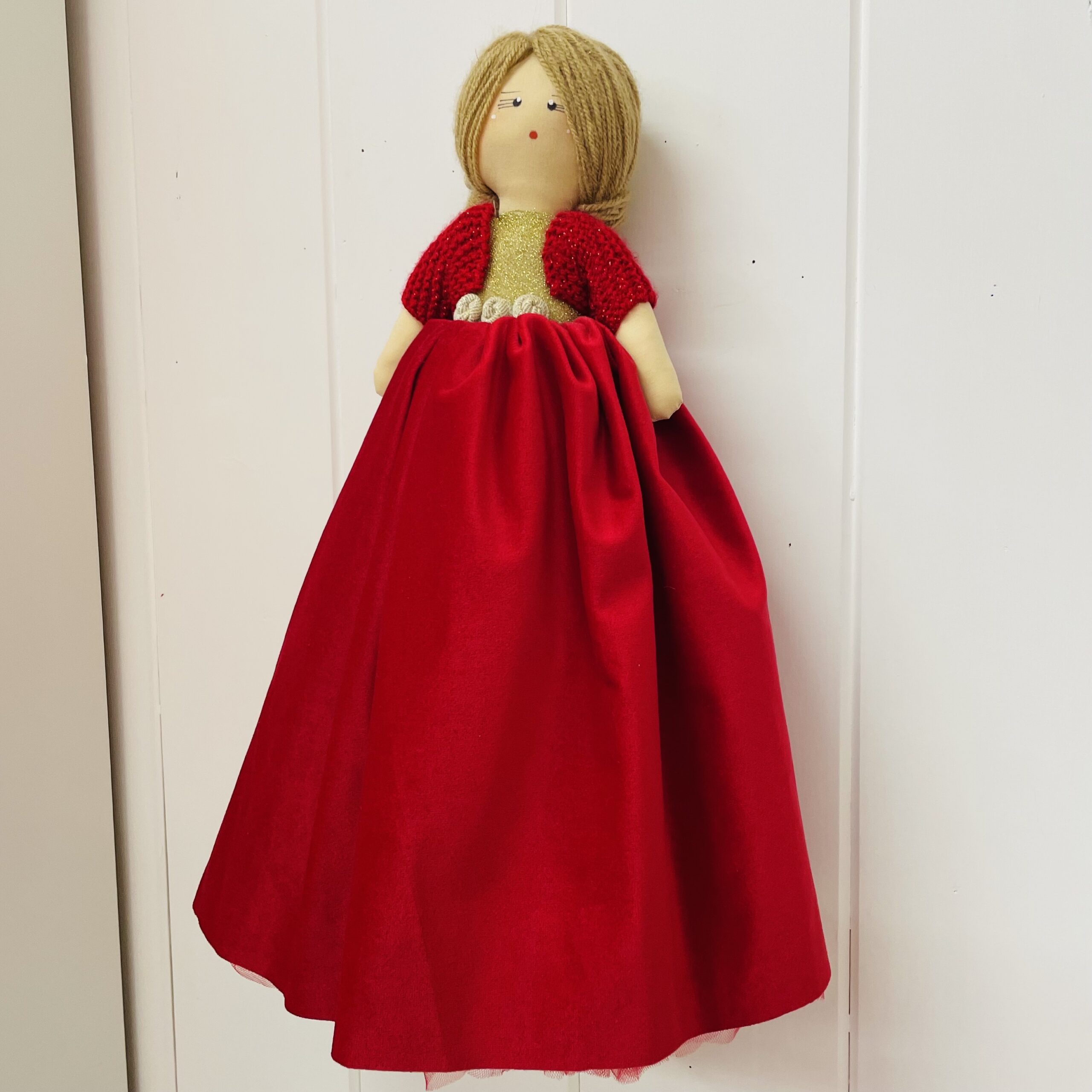 Bambola artigianale in velluto rosso, corpetto color oro glitterato, cardigan in lana rossa lavorato a mano, capelli raccolti con roselline in oro glitterato