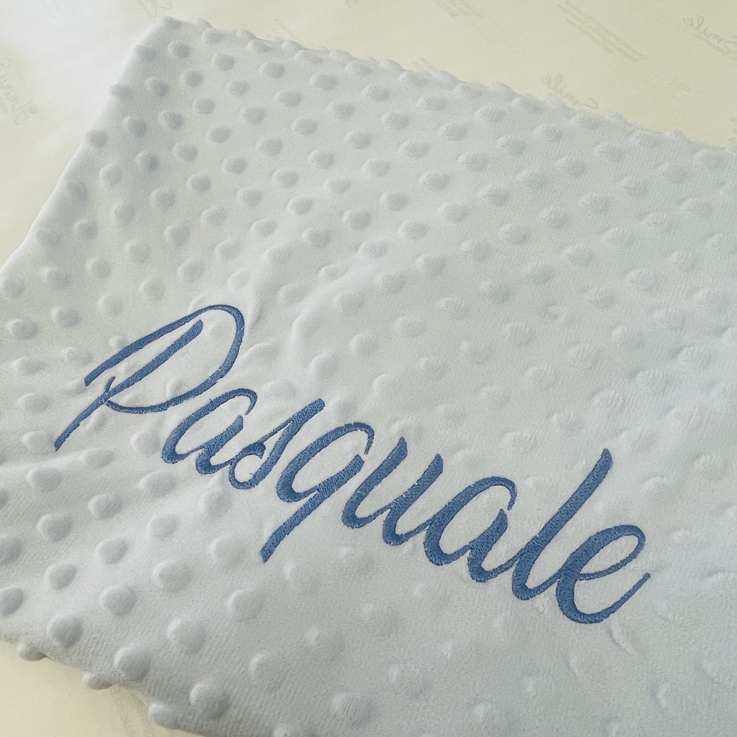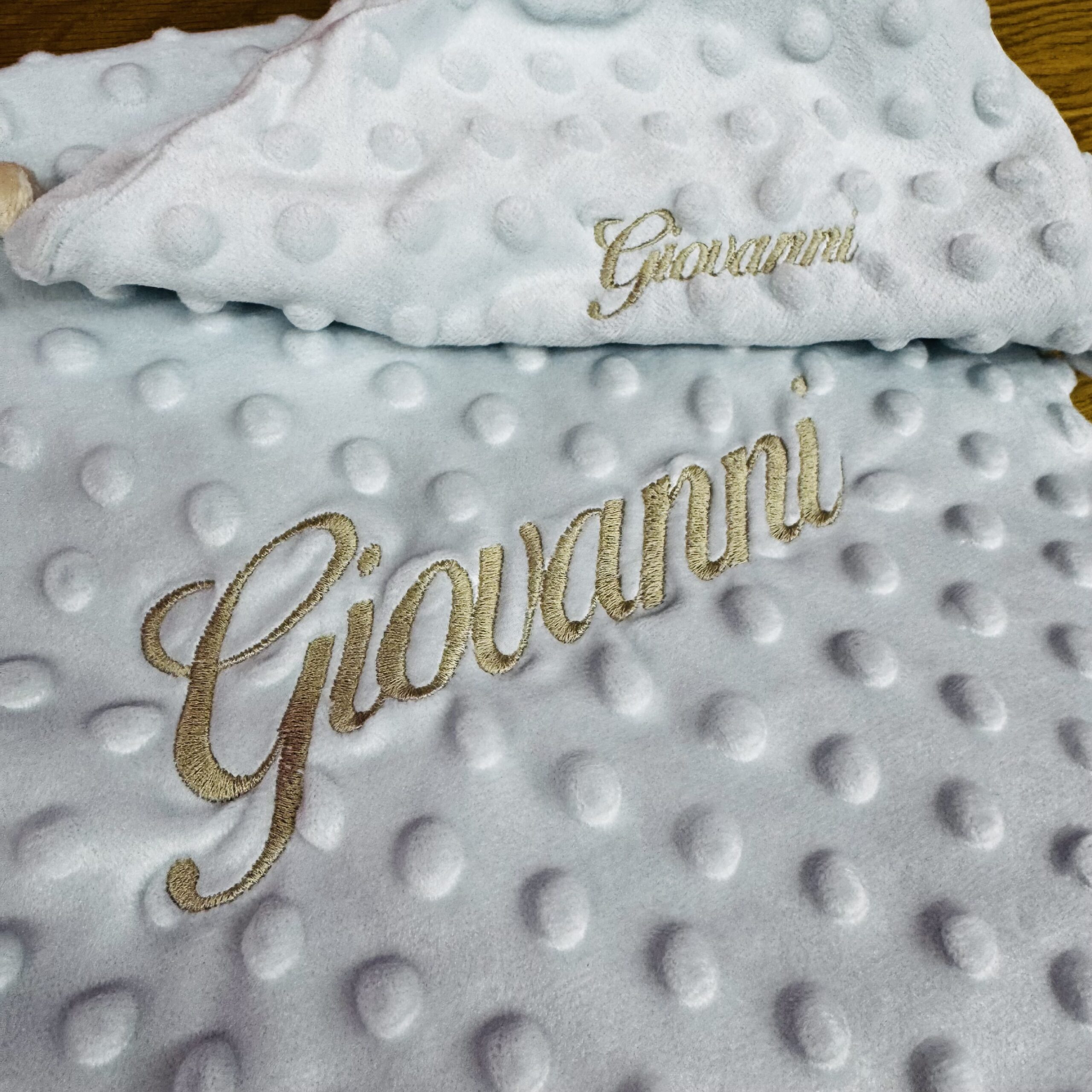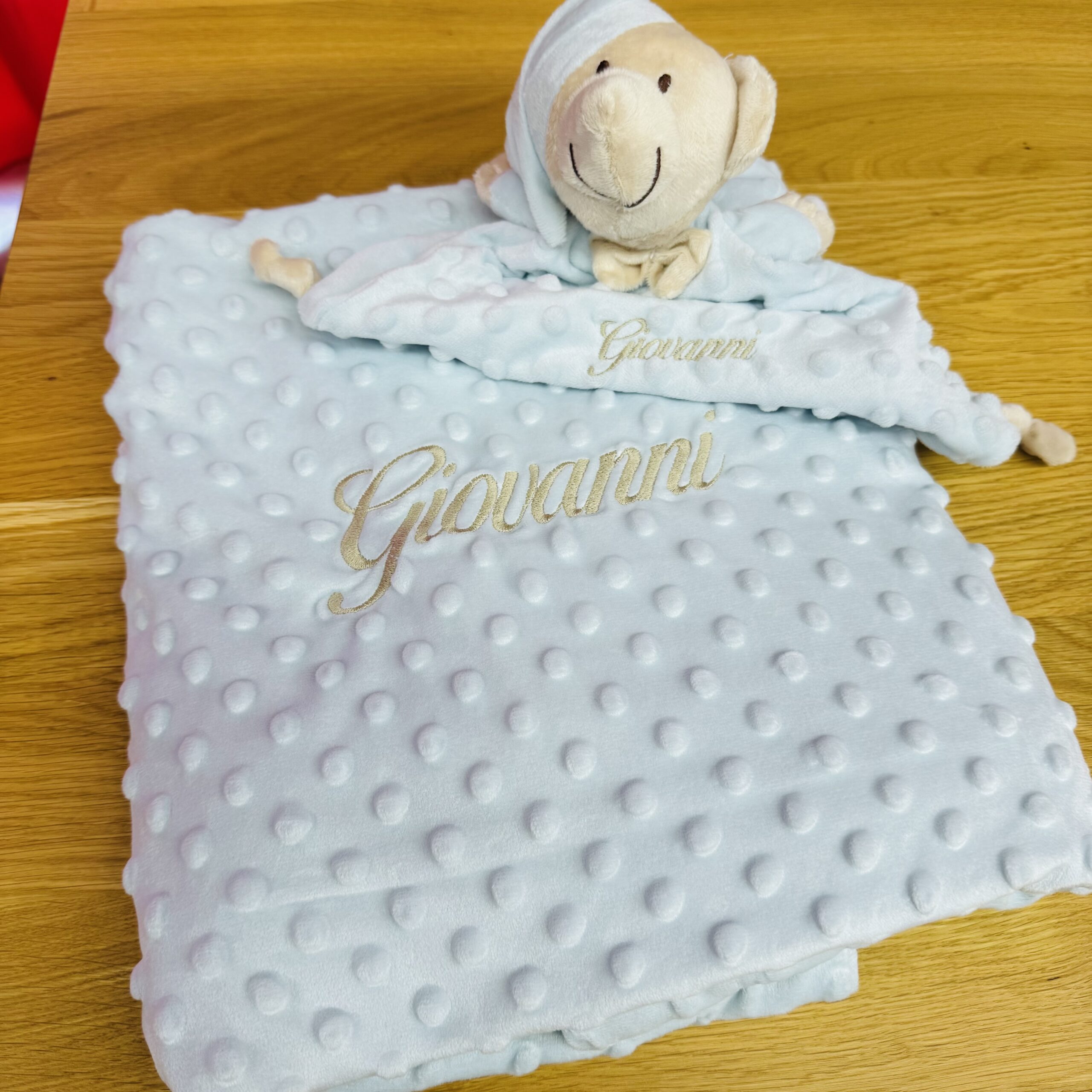La copertina è personalizzata con il nome ricamato, realizzato con cura sartoriale, ed è proposta in coordinato con il doudou, anch’esso personalizzato, per creare un set armonioso ed elegante. Un dettaglio che rende questo articolo unico e speciale, pensato per accompagnare il bambino nei suoi primi mesi.