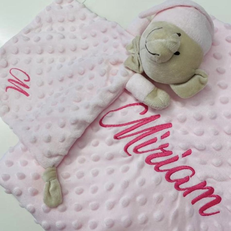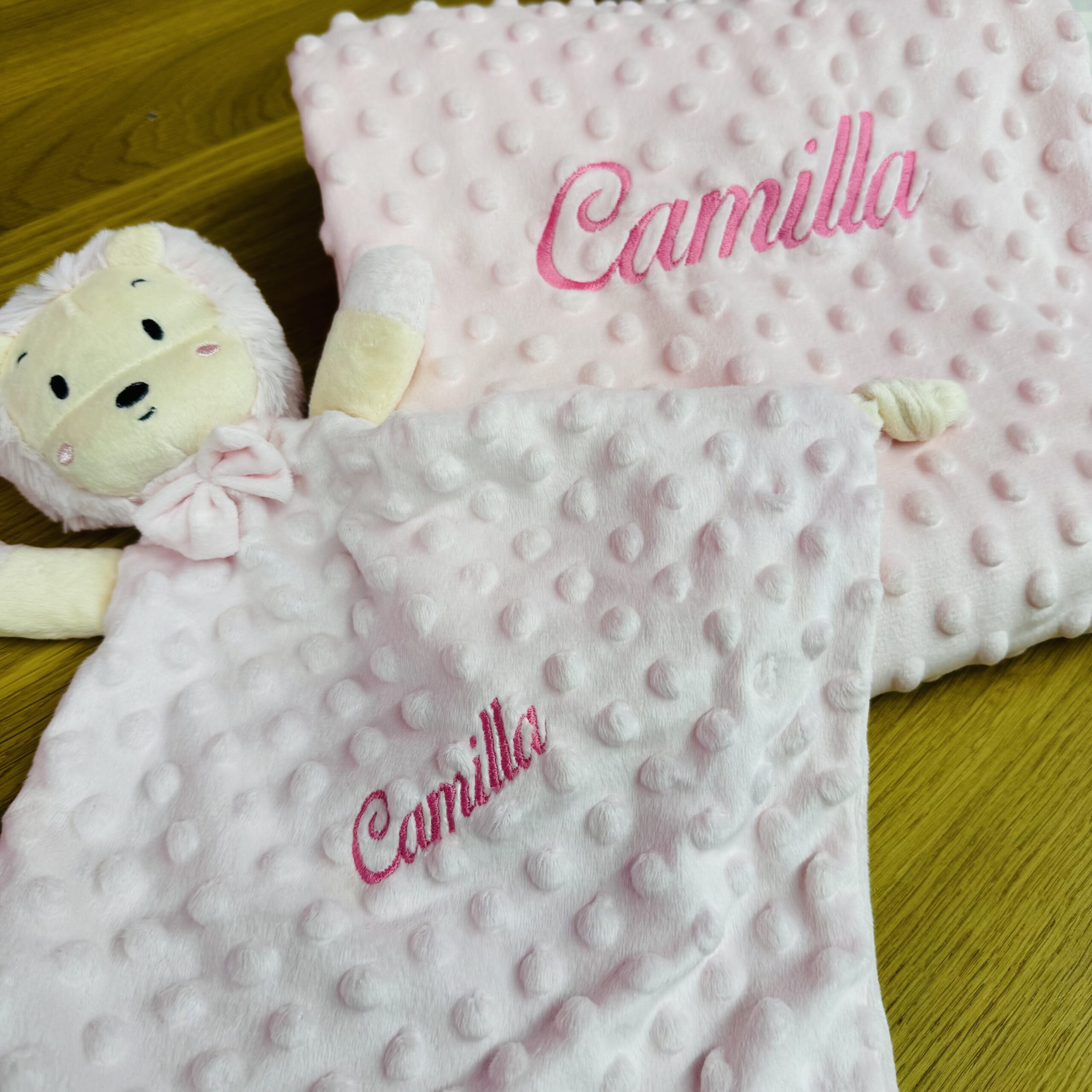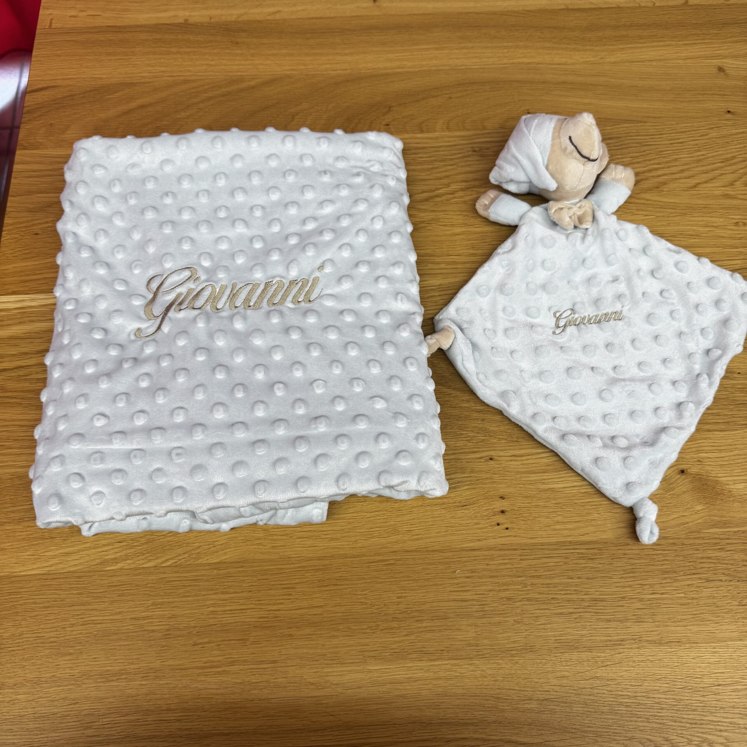 La copertina è personalizzata con il nome ricamato, realizzato con cura sartoriale, ed è proposta in coordinato con il doudou, anch’esso personalizzato, per creare un set armonioso ed elegante. Un dettaglio che rende questo articolo unico e speciale, pensato per accompagnare il bambino nei suoi primi mesi.