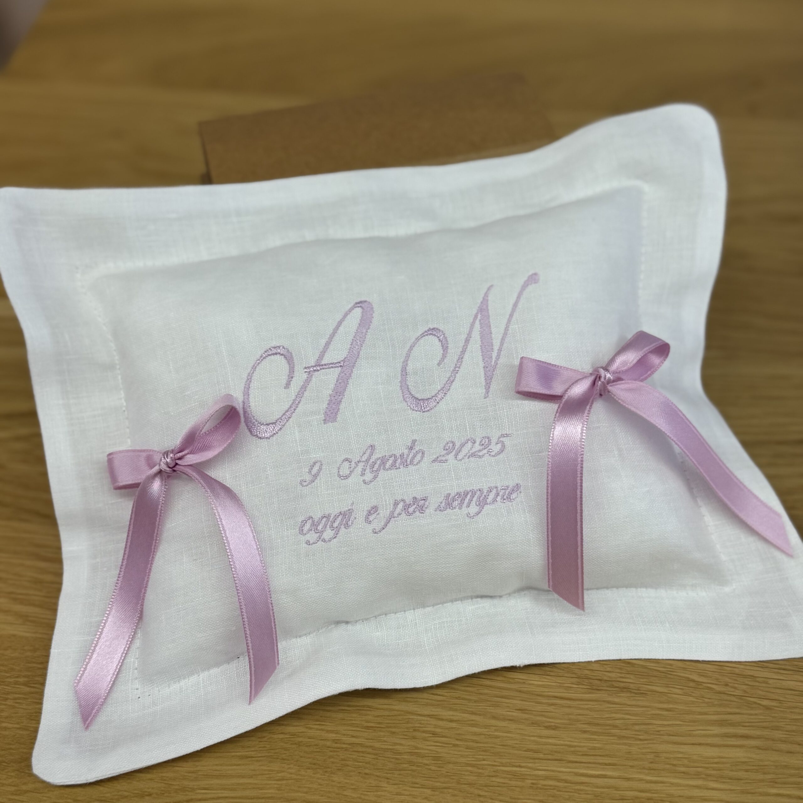Il cuscino di base è realizzato interamente in lino bianco, poichè viene abbinato all’abito della sposa; ai bordi è rifinito con un voilà sempre in lino. Al centro è possibile ricamare le iniziali e la data dell’evento, oppure una piccola scritta, impreziosendo ancora di più il cuscino. Vengono poi posti dei fiocchetti per legare le fedi, in organza o raso.