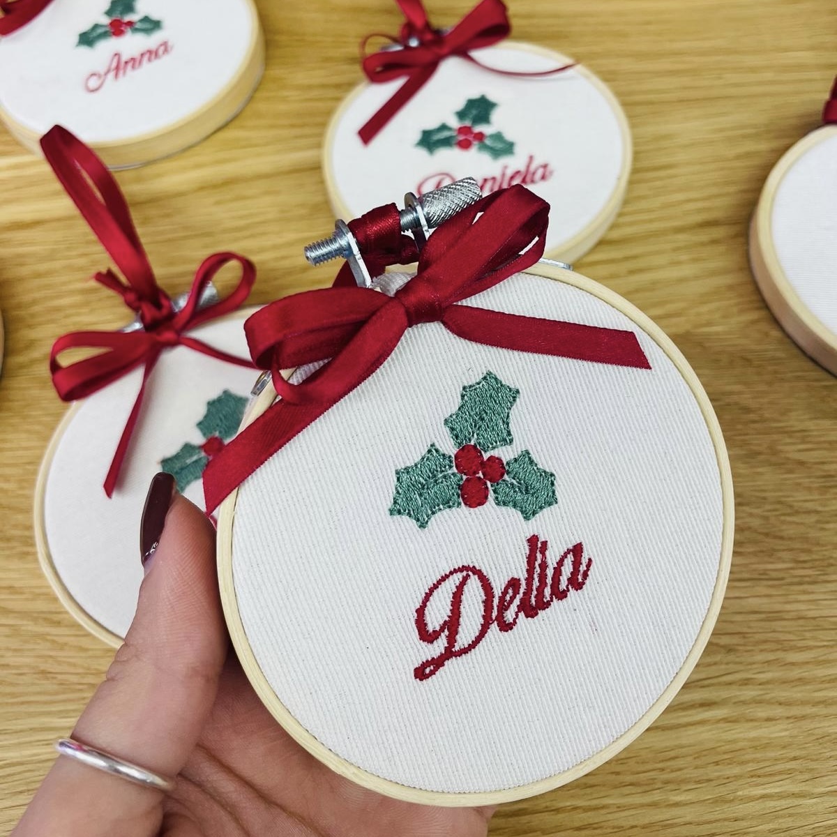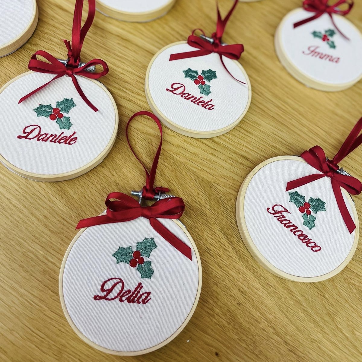 Aggiungi un tocco di eleganza e calore alla tua tavola con i nostri segnaposto natalizi personalizzati. Realizzati a mano in puro tessuto bianco e racchiusi in un delicato telaio in legno, sono impreziositi da un raffinato ricamo con agrifoglio e bacche rosse, simbolo del Natale. Ogni segnaposto può essere personalizzato con il nome dei tuoi ospiti, rendendo l’atmosfera ancora più accogliente e unica.