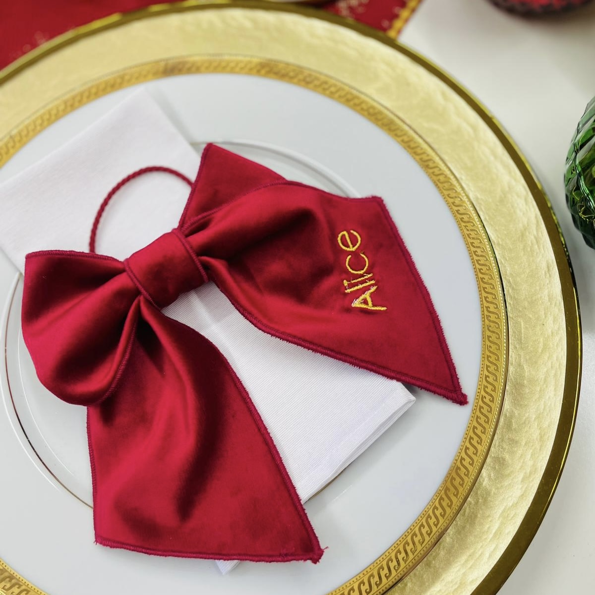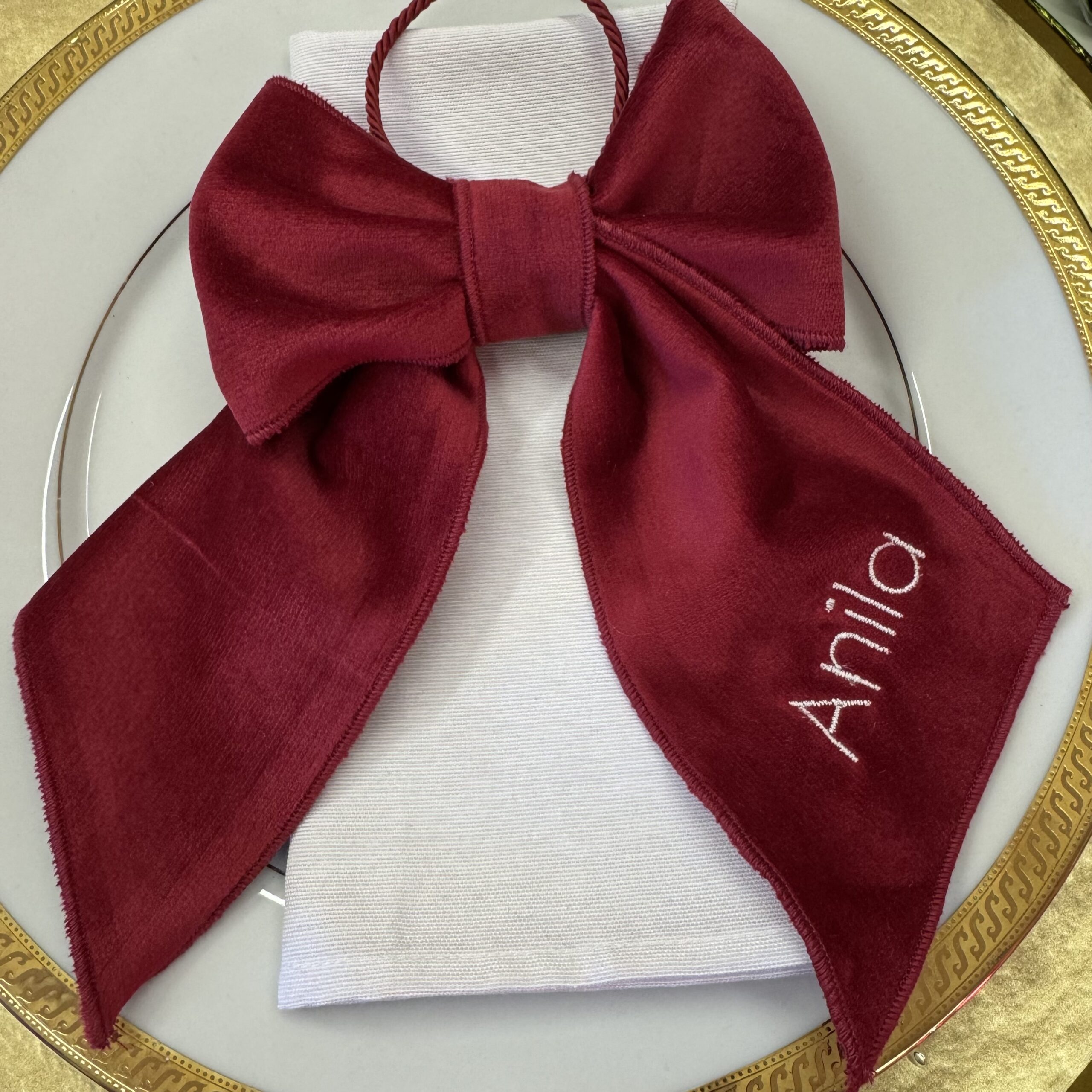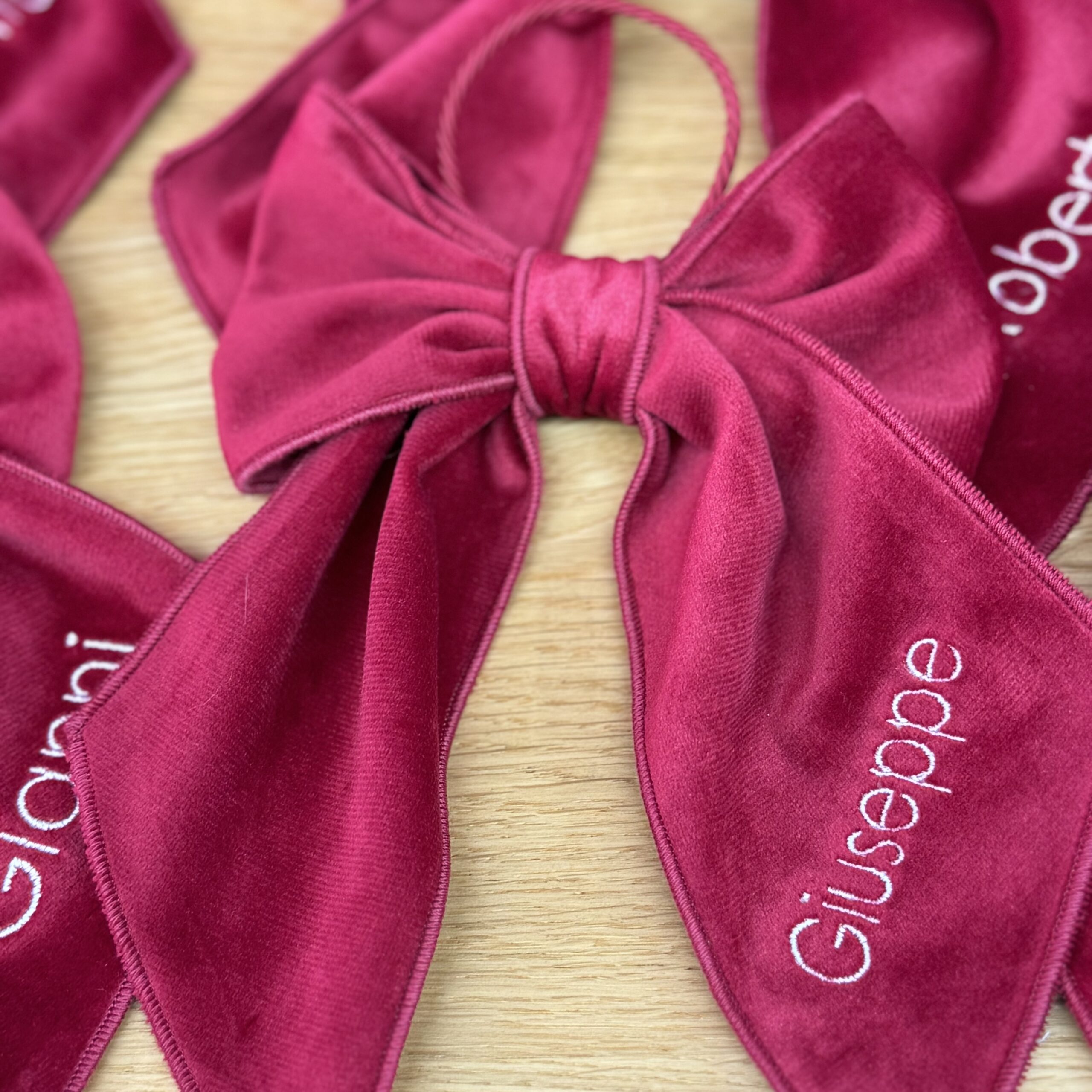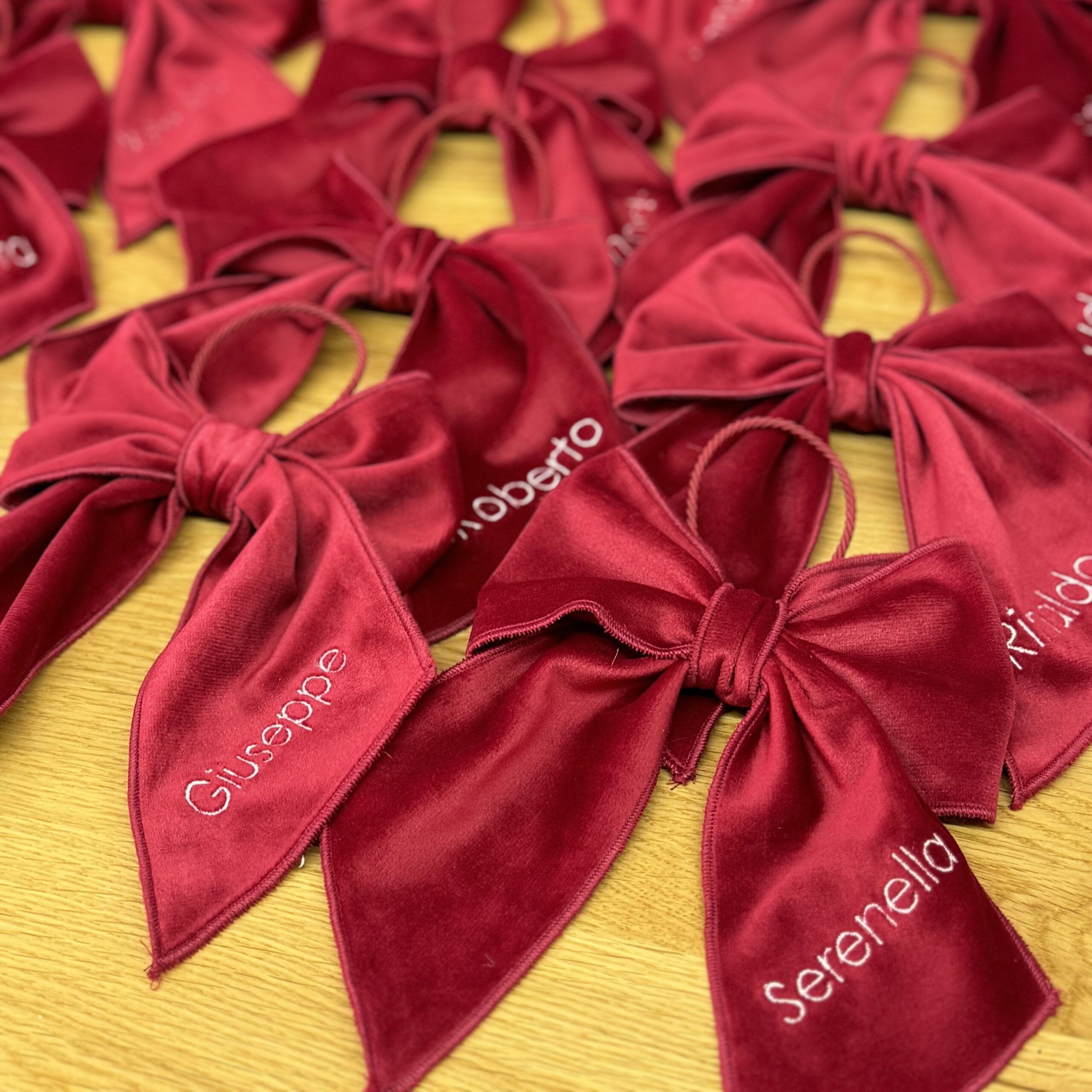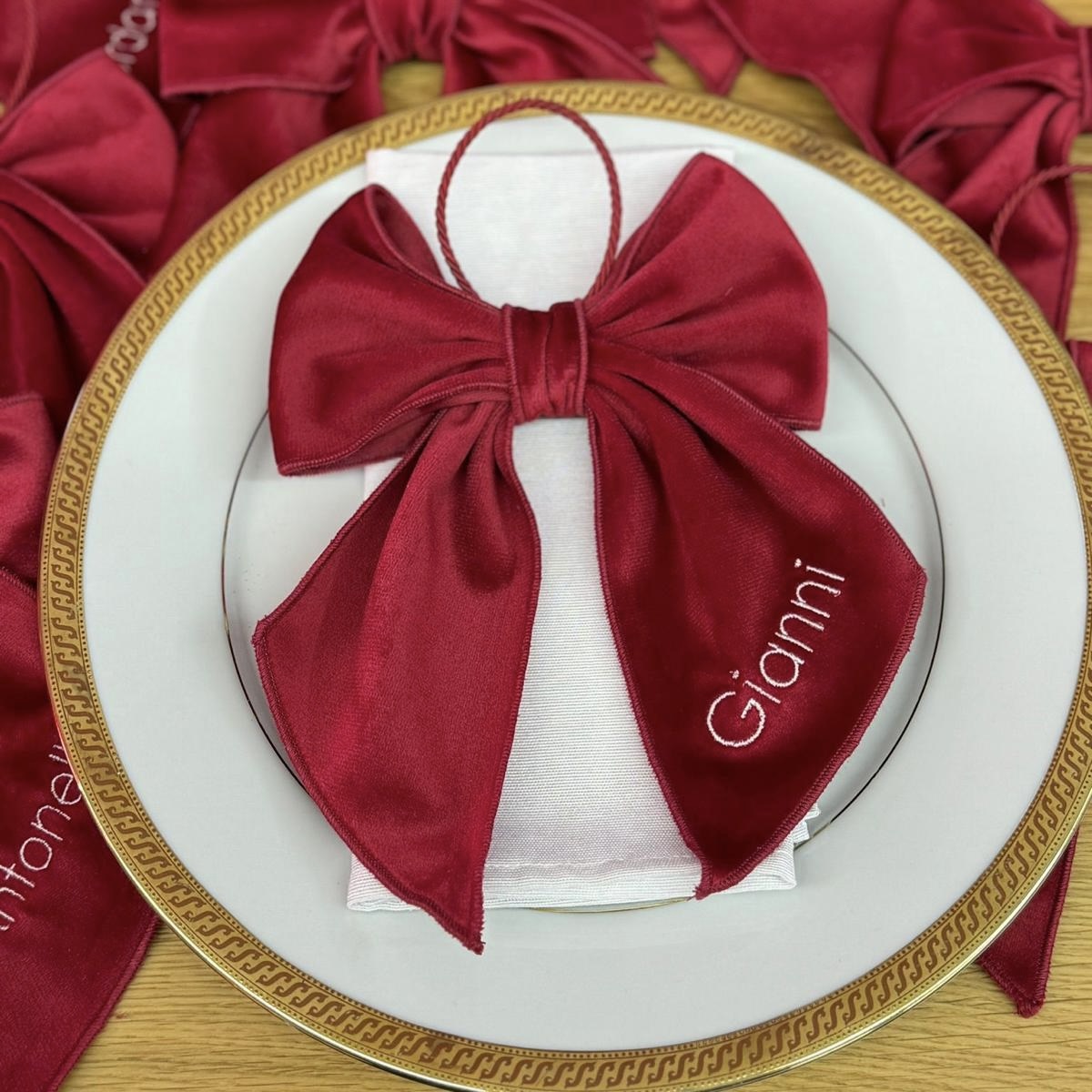 Ogni fiocco è confezionato con cura in velluto morbido e luminoso, e viene personalizzato con il ricamo del nome per rendere unico ogni posto a tavola.