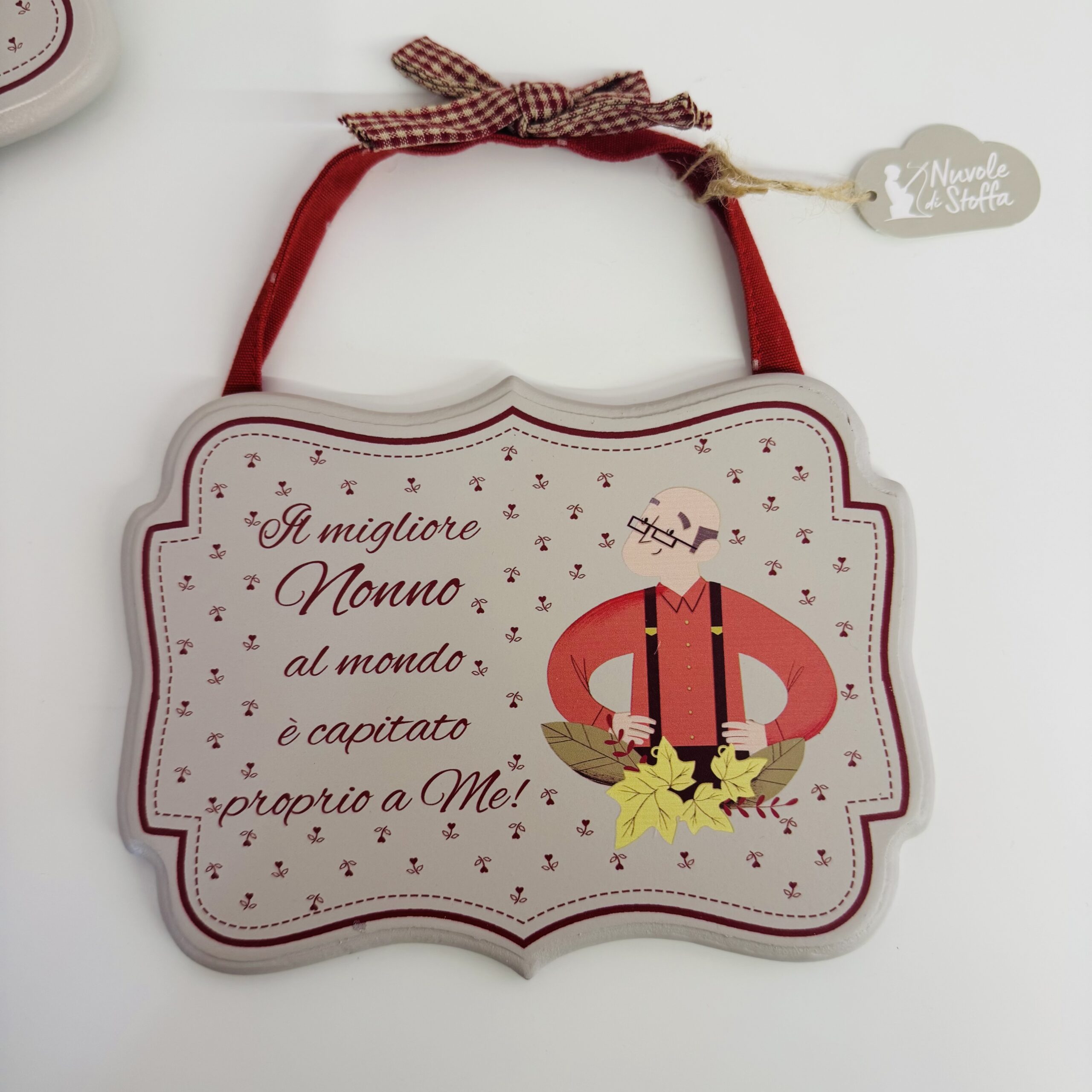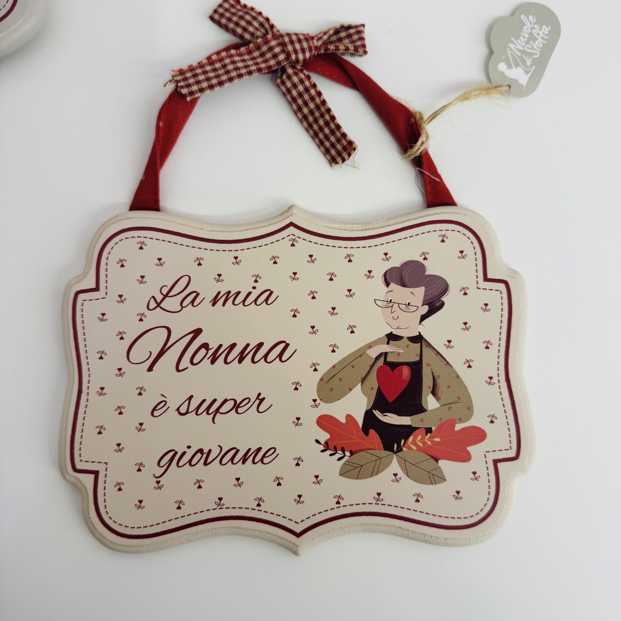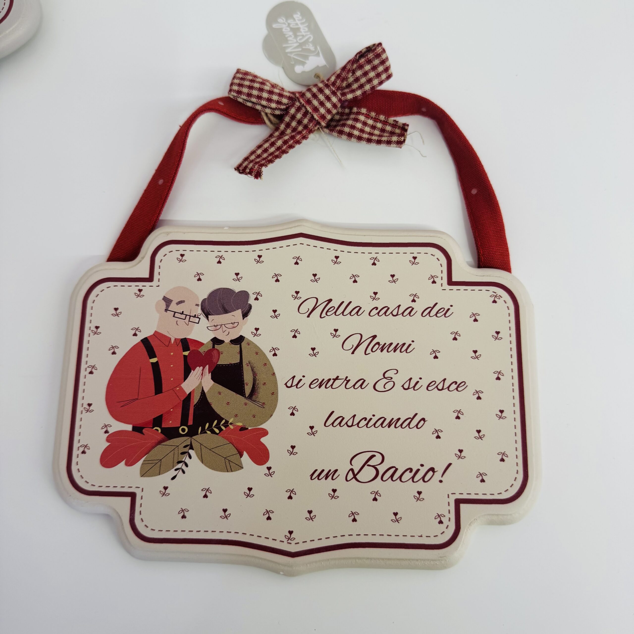 Ogni targa è realizzata con cura e arricchita da un nastrino in tessuto con fiocco, pronta da appendere in casa.