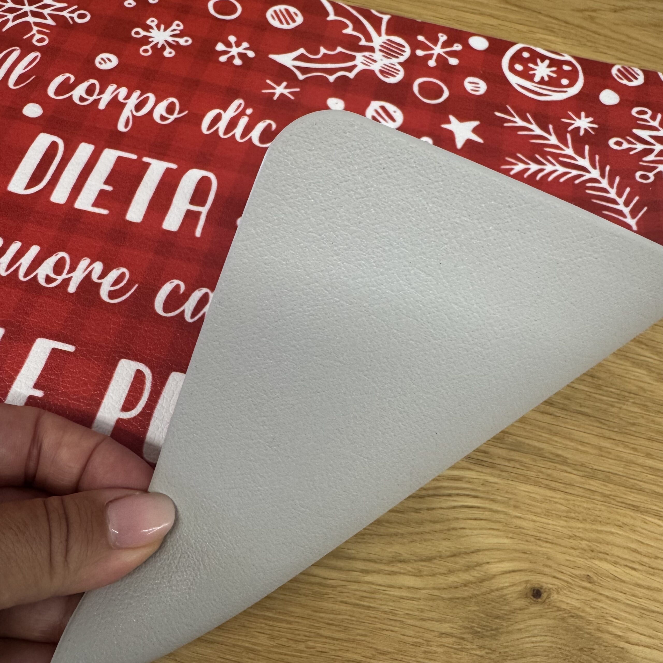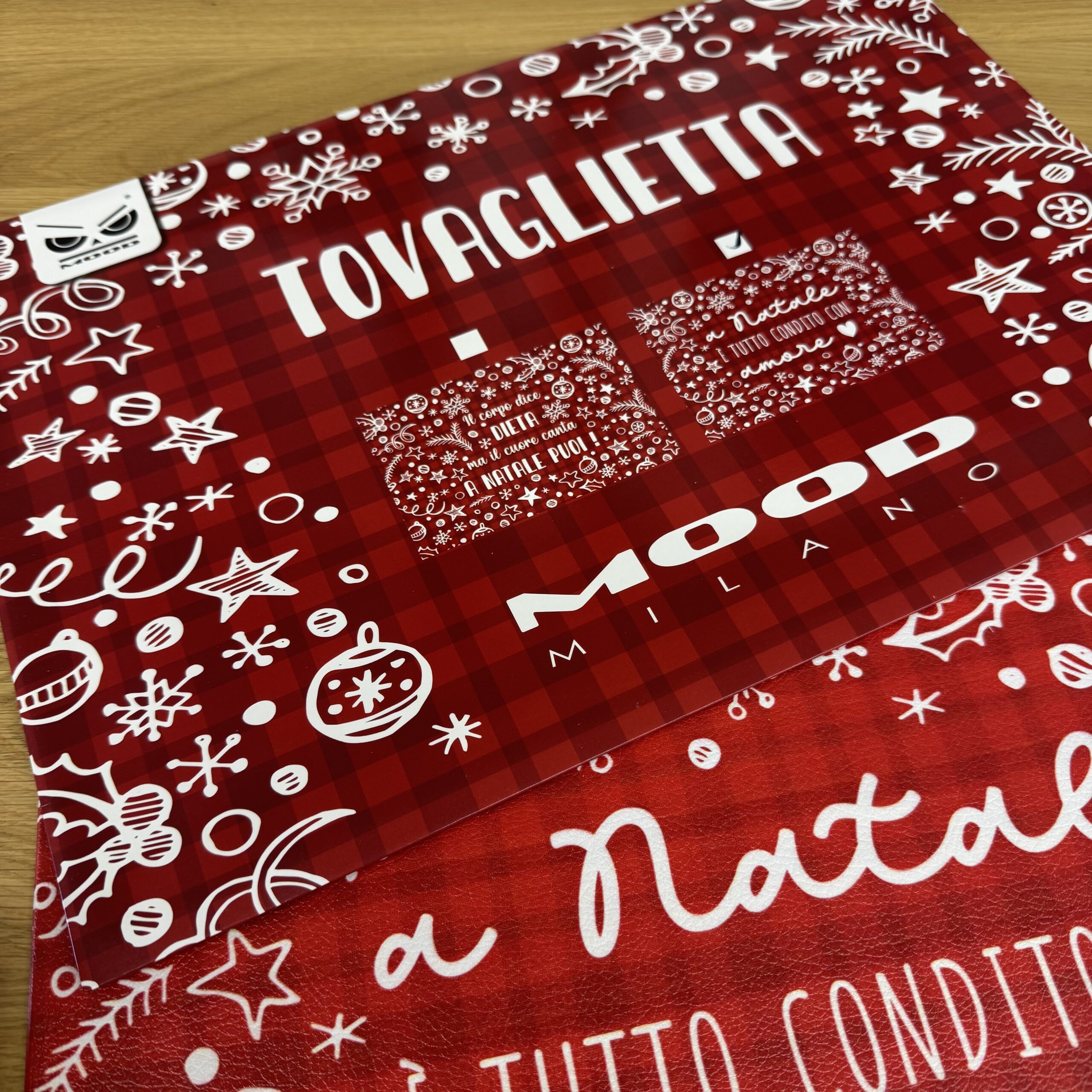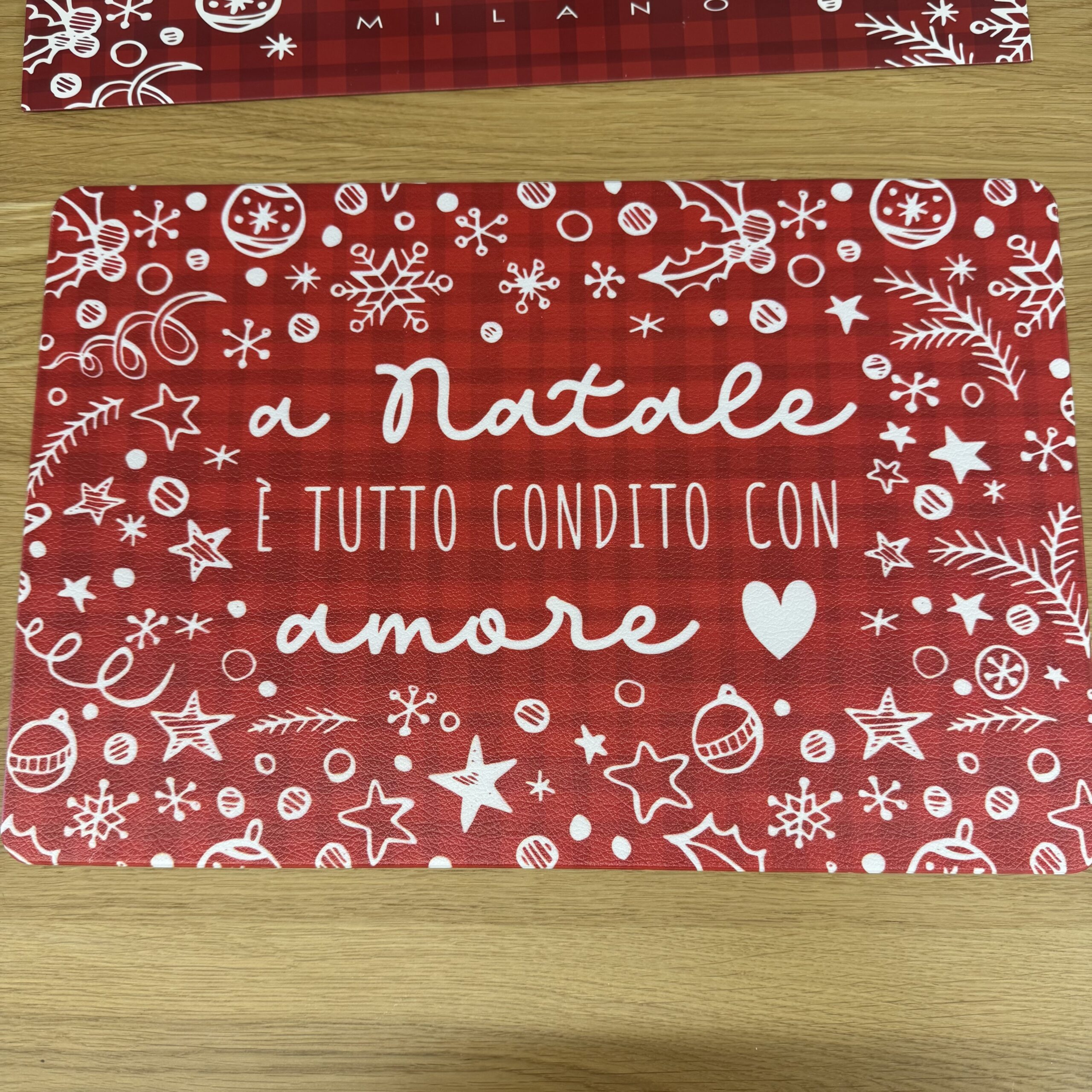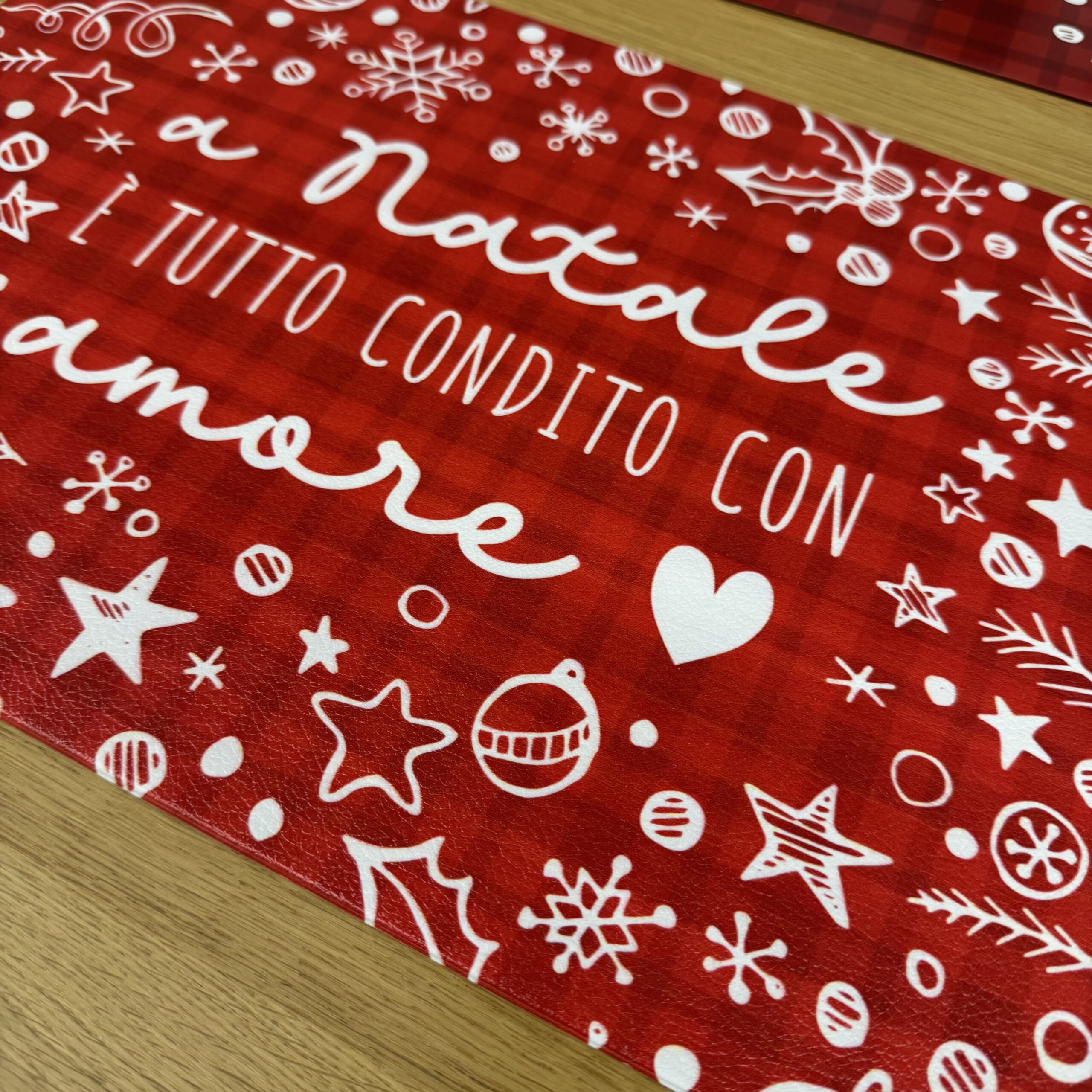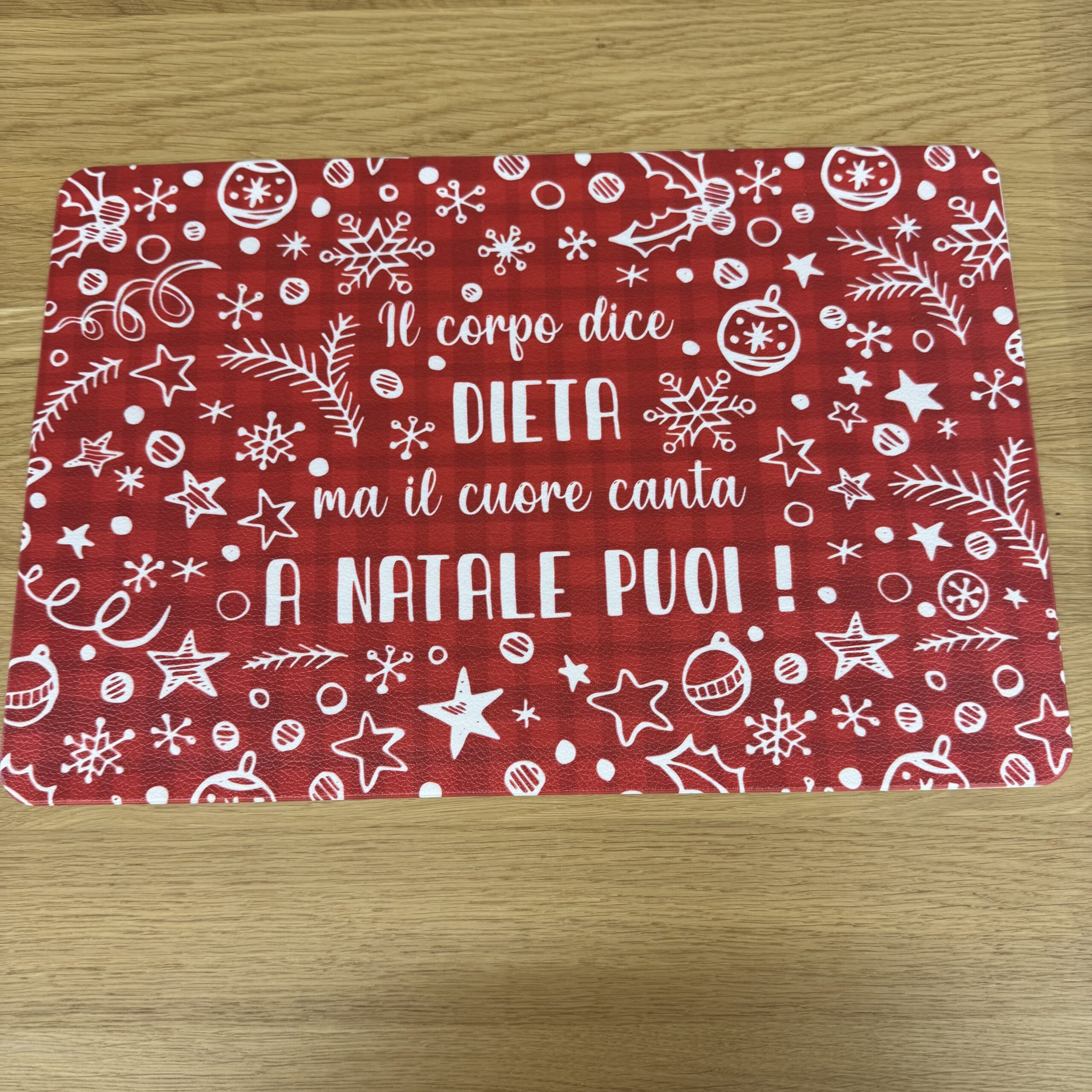 Il design rosso con scritte e decori natalizi porta allegria e calore sulla tavola, rendendo ogni pasto un momento speciale.