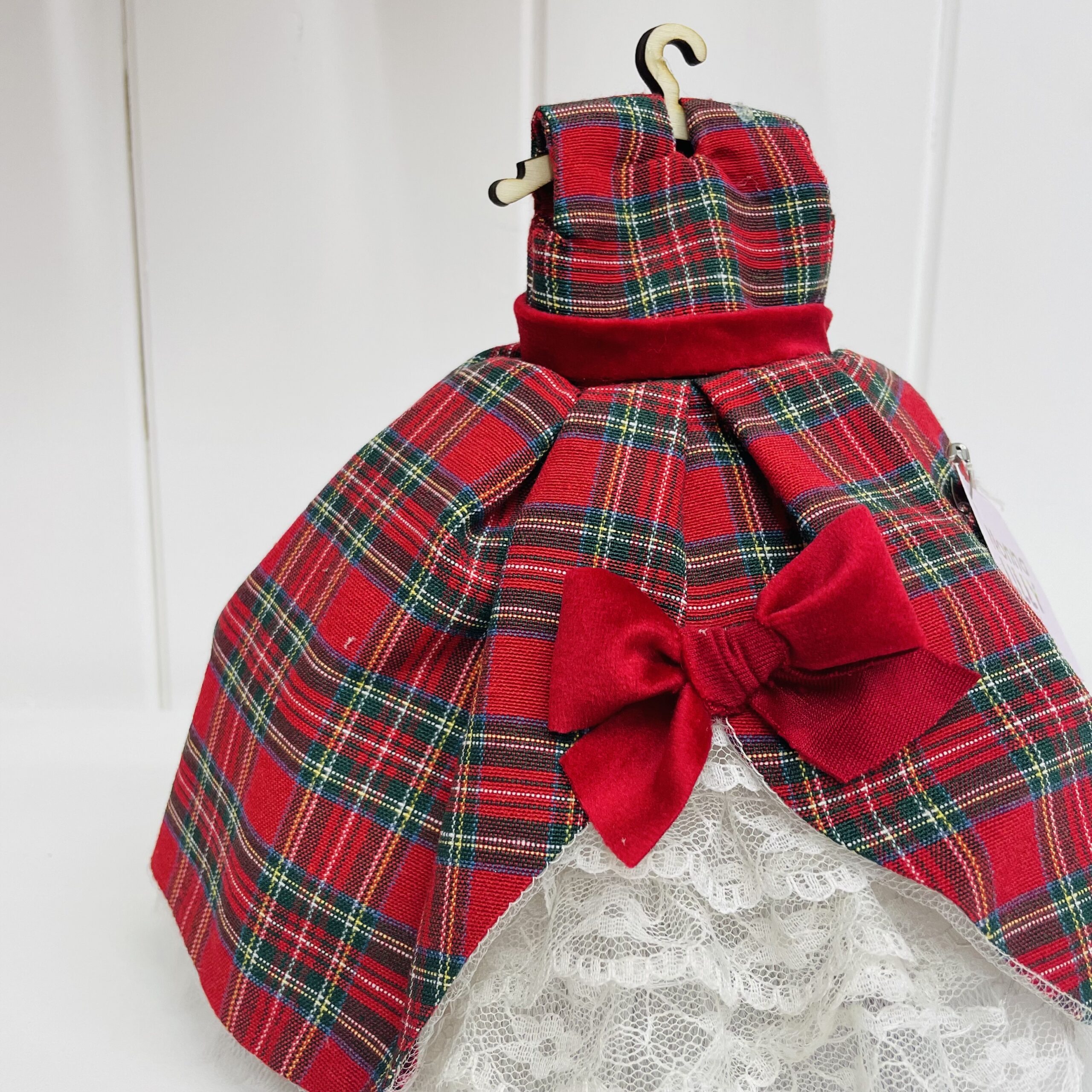 Vestito sartoriale in tartan e pizzo, con cintura in vita e fiorellino in velluto. Sotto la gonna, nascosto nel tulle, c’è un sacchettino trasparente che contiene dei granelli di profumo.